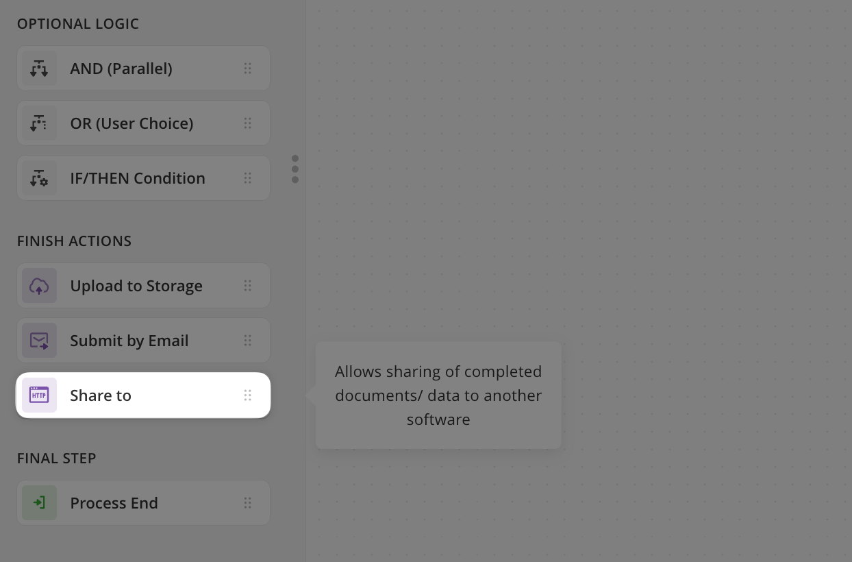 Drag and drop Share to submit action to the Workflow chart and connect it with the User task that your team will be working on.