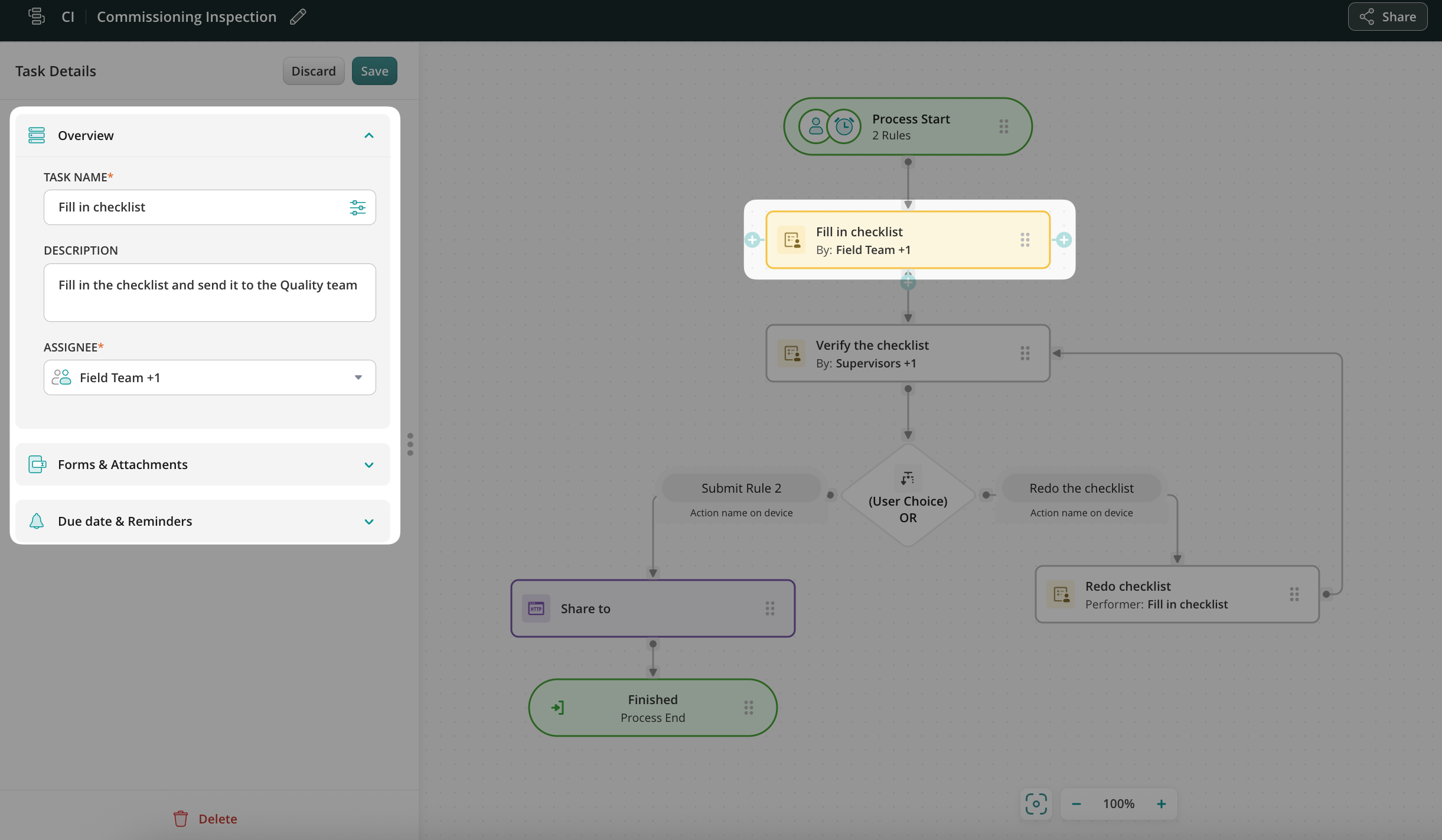 If necessary, add additional tasks for other process participants and connect the tasks. The workflow example below shows a fully configured flowchart with a revision task and communication loop between the field team and supervisor.