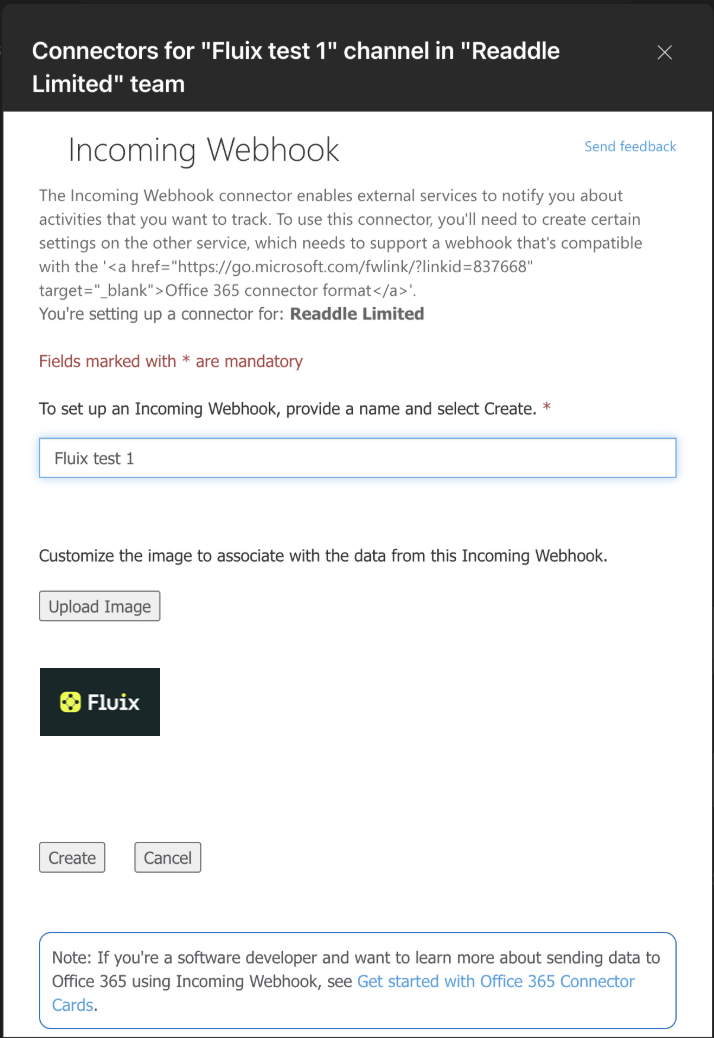 2. In the opened window, click Add to a team and then select the channel from the list to which the notification will be send out from Fluix through webhook. Then, click Set Up a connector.