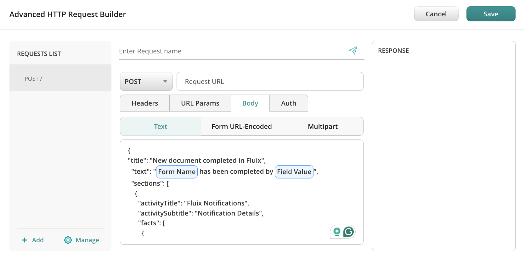 In the opened Advanced HTTP Request Builder, configure the request name, let’s say “Fluix/Teams integration”, select ‘POST’ as the request type, and add the request URL. The respective URL can be found in your company’s Teams account by the following steps: