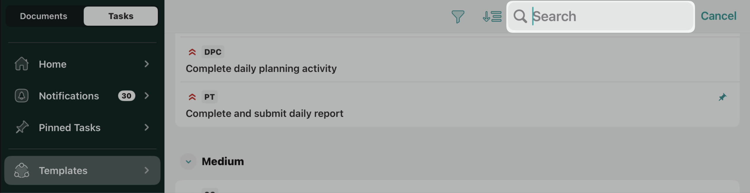 In the upper right corner of the Templates section, use the Search icon to locate the tasks you need to complete.