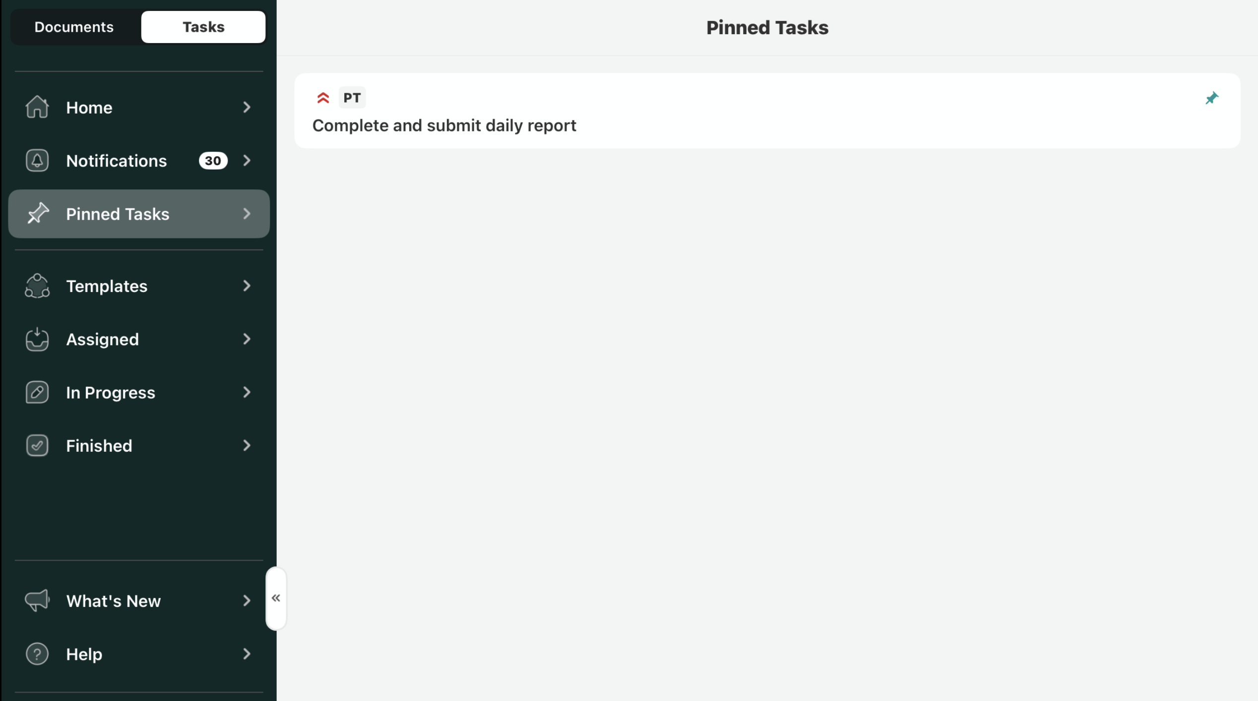 If you edit a document from a pinned task, the task will automatically move to the In Progress section to reflect the changes.