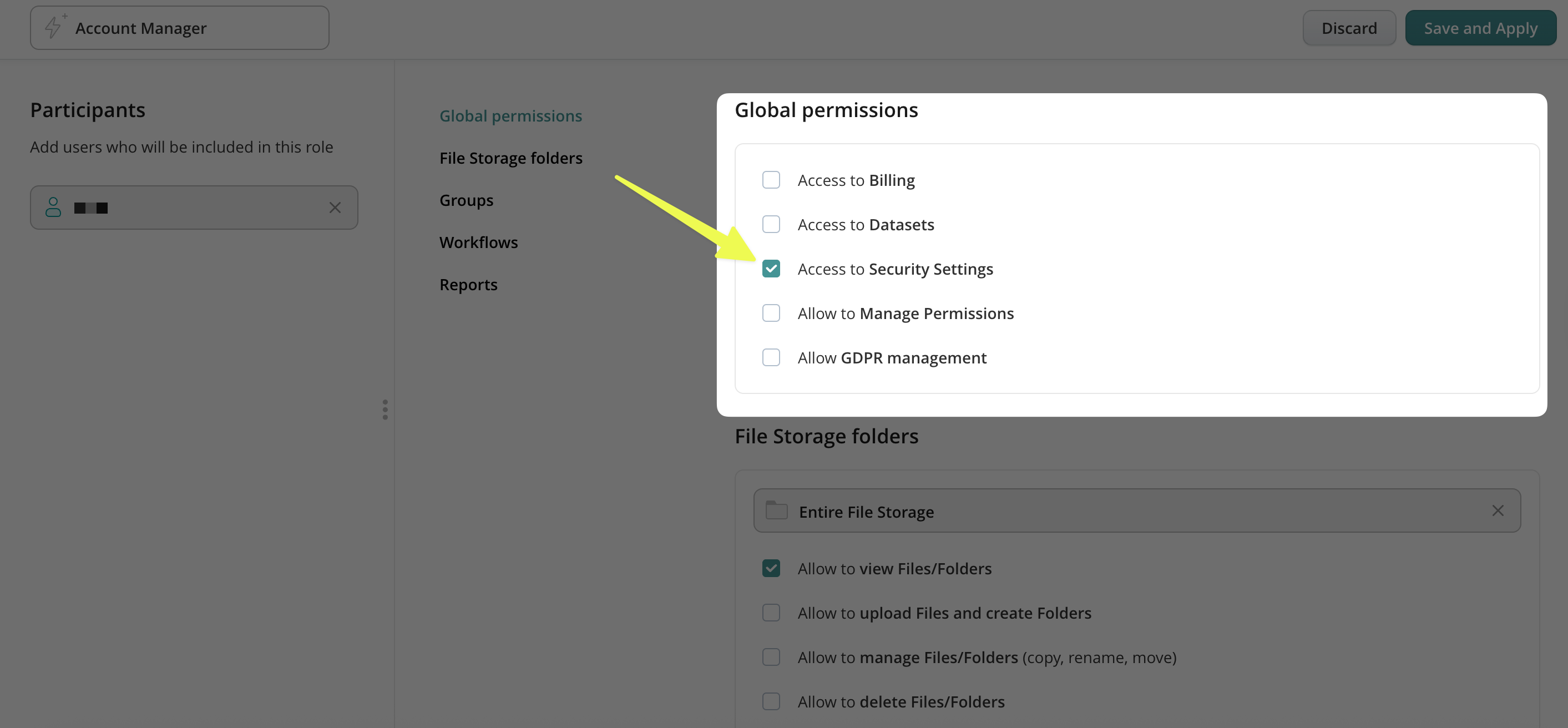 To manage the Retention Policy settings, you should have the permission to access the Security Settings, which your account admin can grant by following the guidelines below: