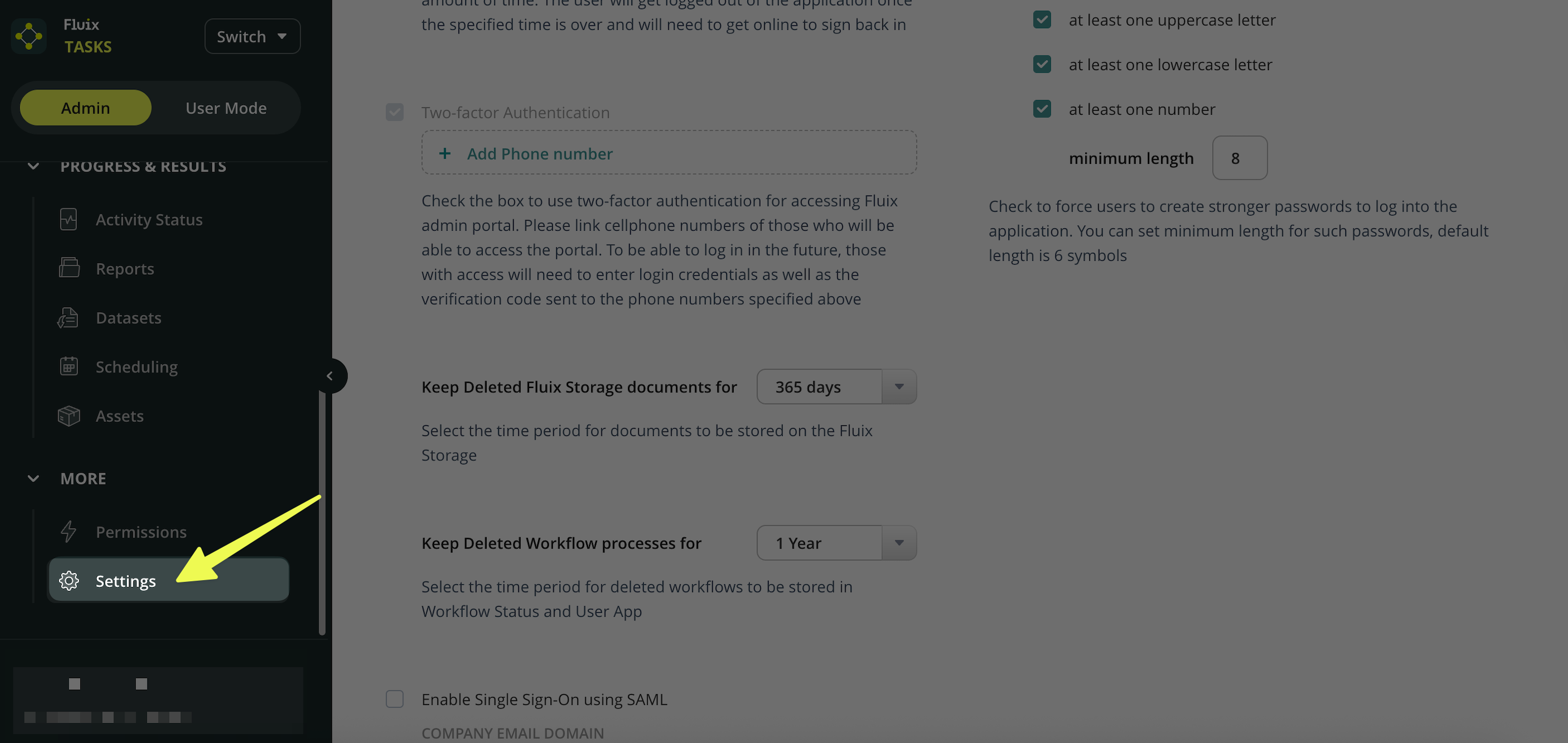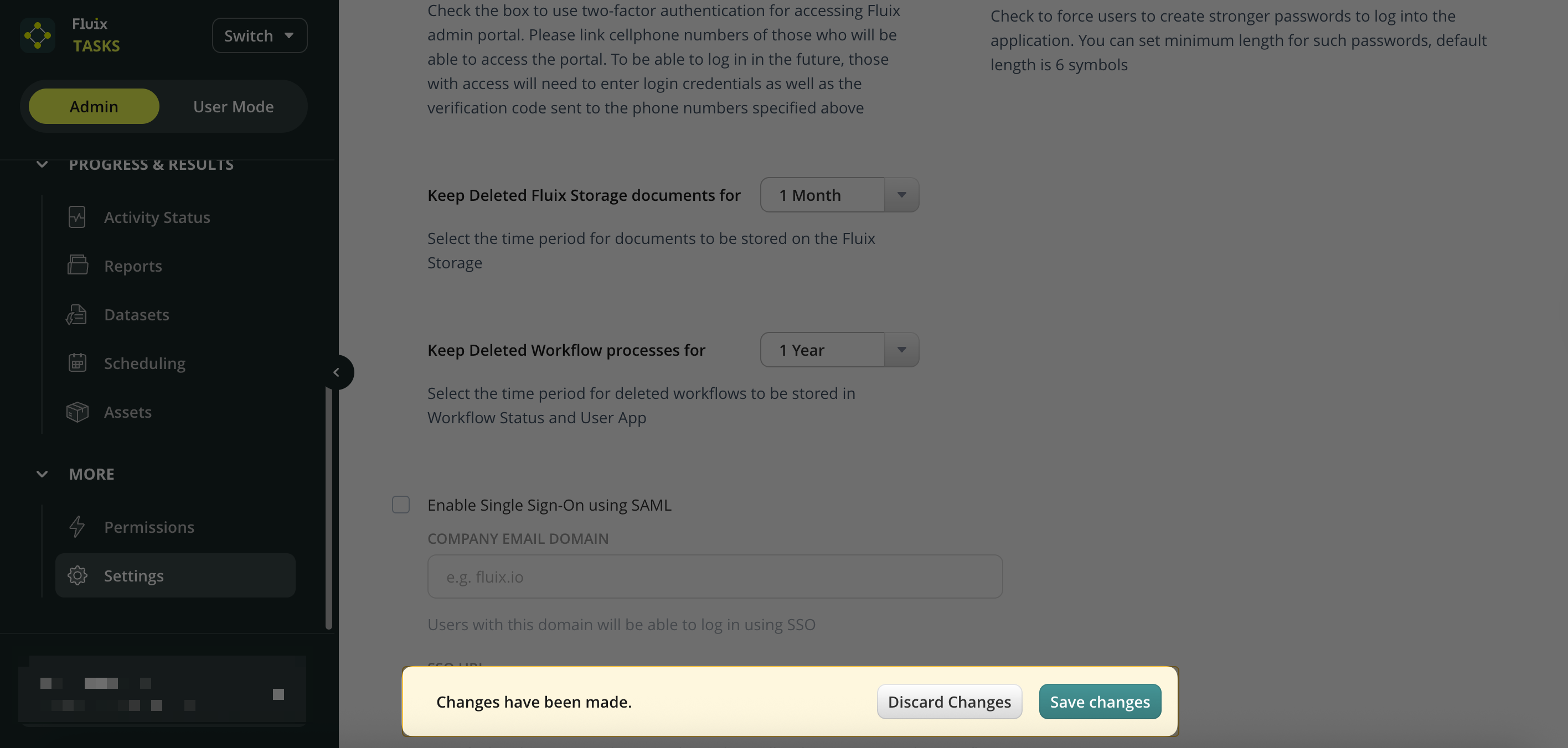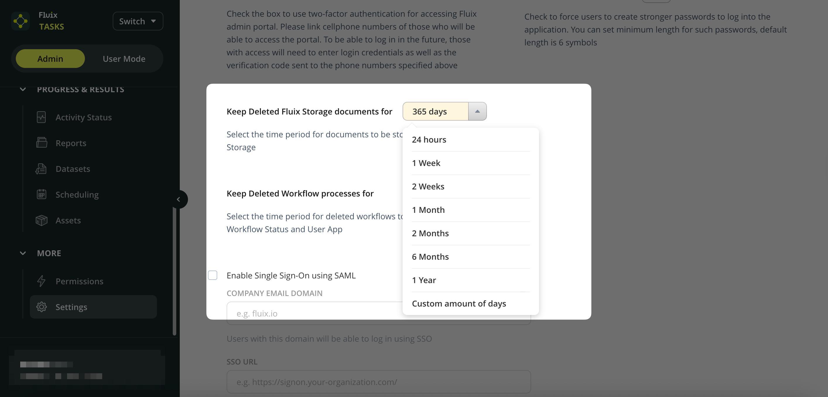 Keep Deleted Fluix Storage Documents for.. is the setting that controls the period during which you’d like Fluix to keep documents that were deleted from Fluix cloud storage on our servers.
