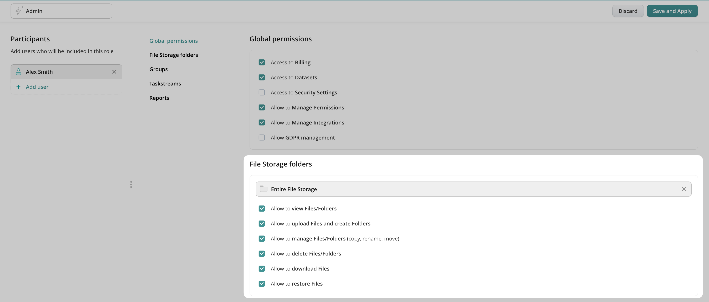 Access to Fluix File Storage is regulated in the Admin Tab -> More -> Permissions section. Simply add a New Role -> select Storage Manager from the list -> select a user -> choose whether the user will have access to the entire storage or just particular folders or subfolders -> check the actions the user will be authorized to take, and save changes.