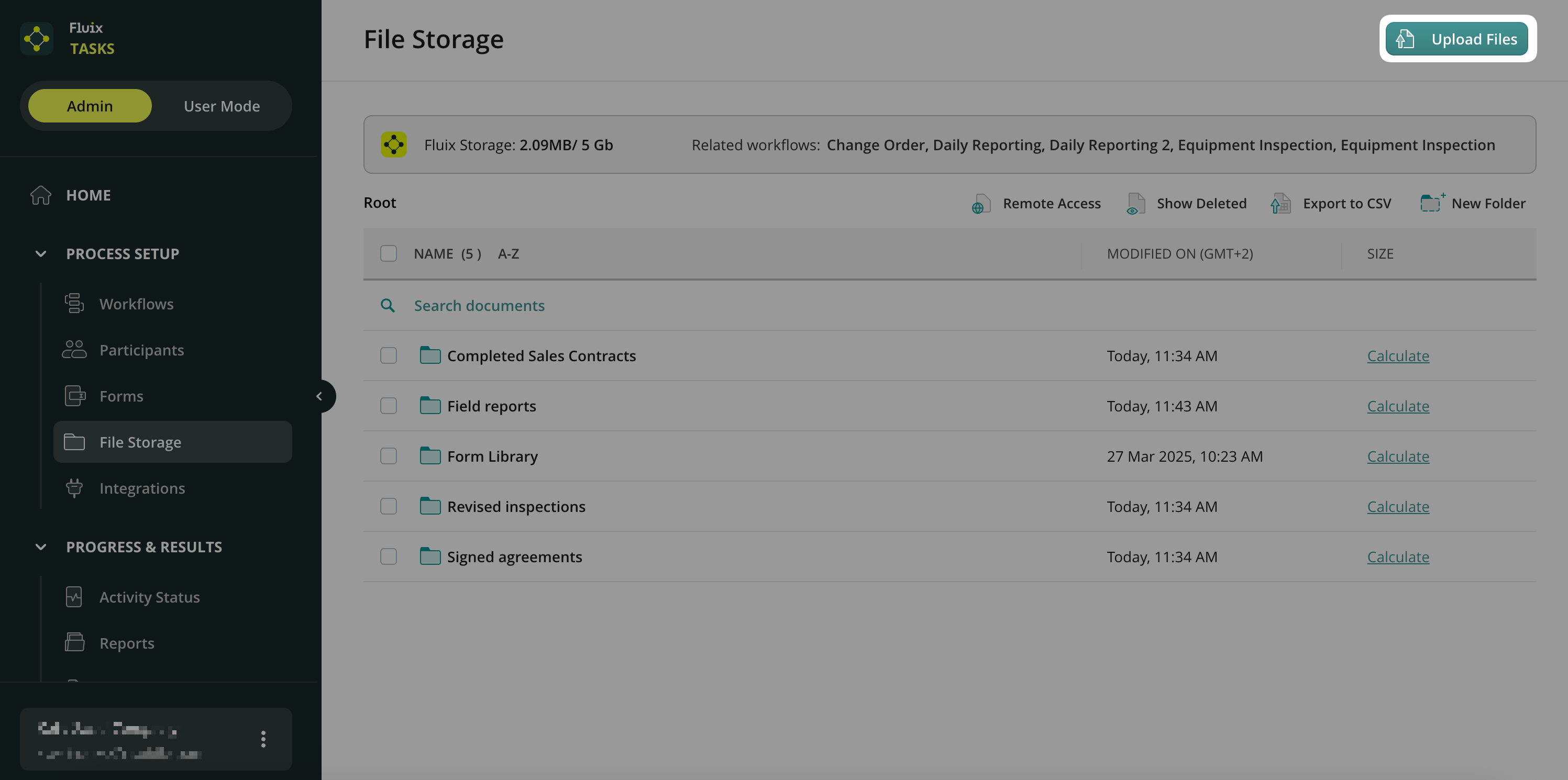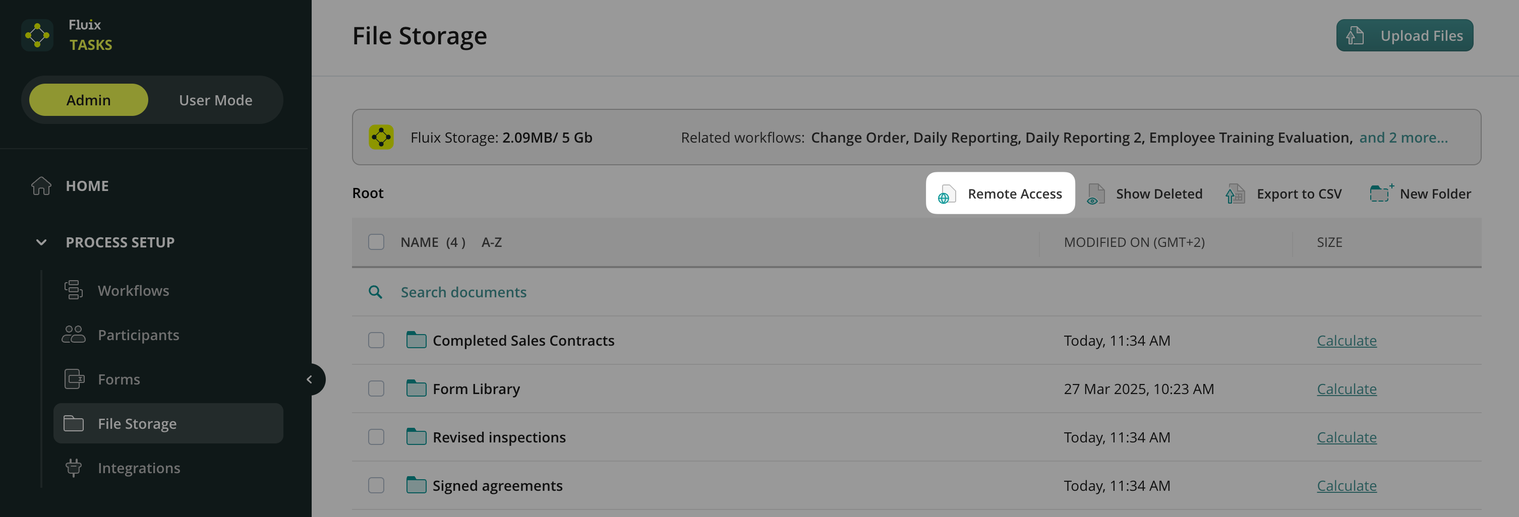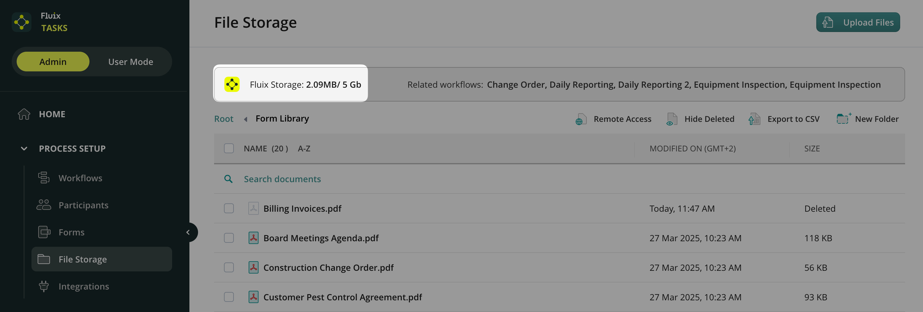 Fluix File storage is managed directly via the Admin tab -> Process Setup -> File Storage section.