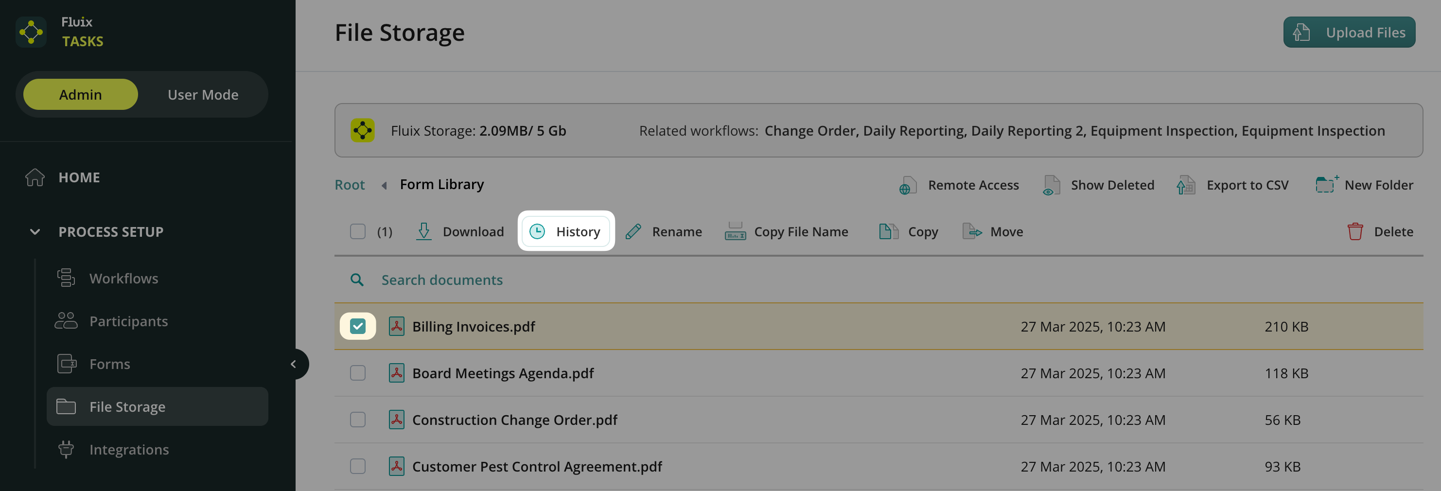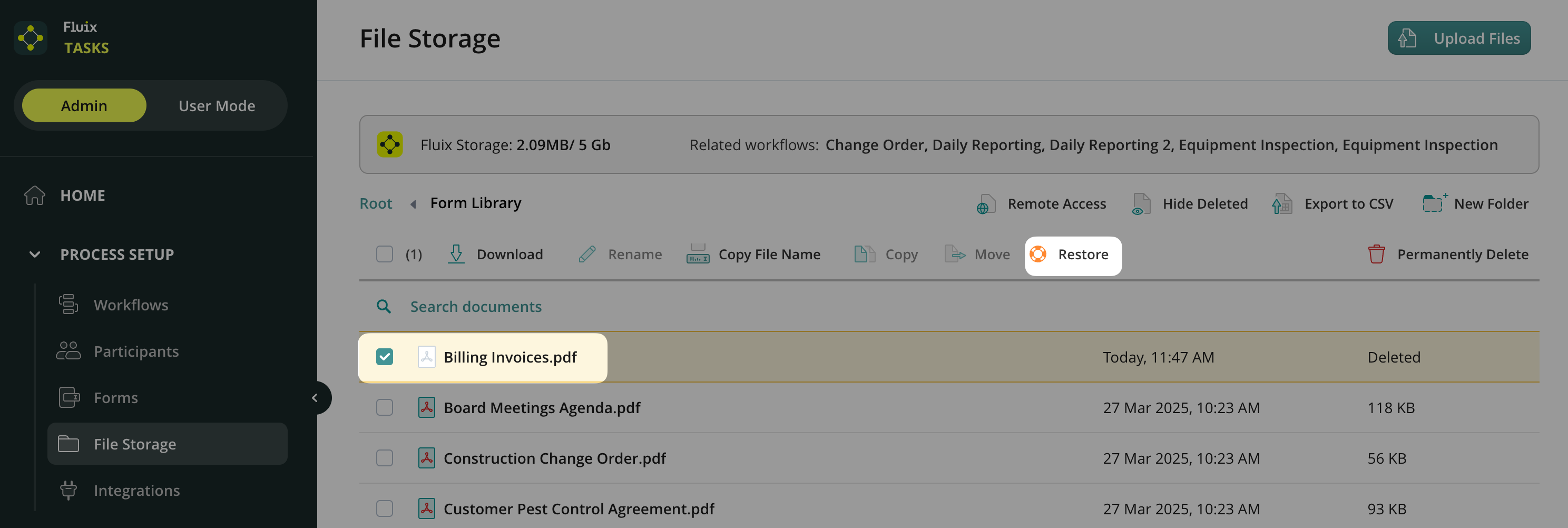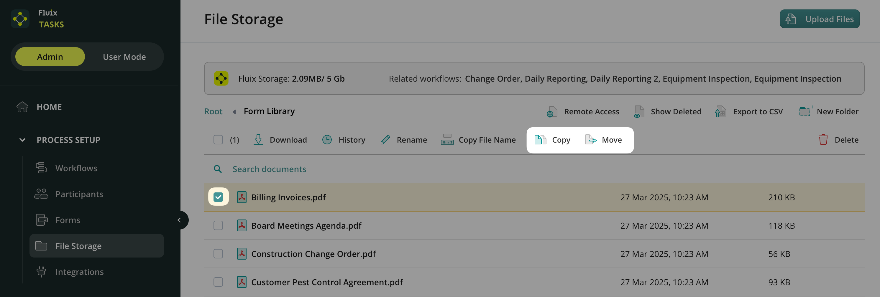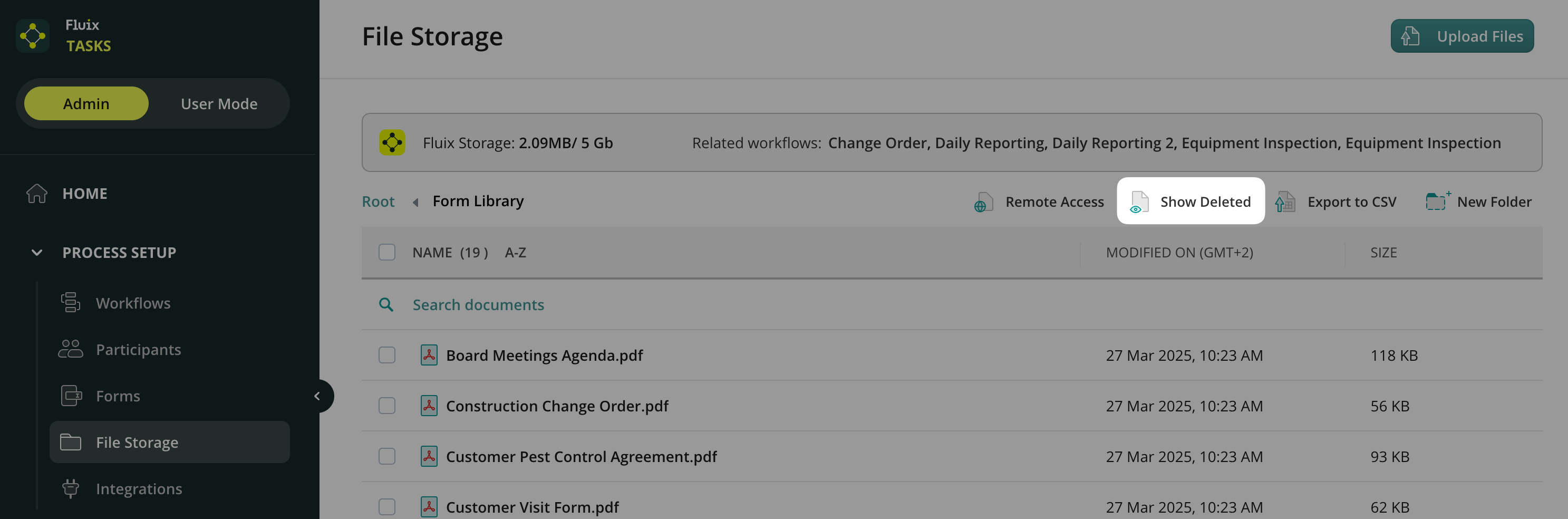 Fluix File storage is managed directly via the Admin tab -> Process Setup -> File Storage section.