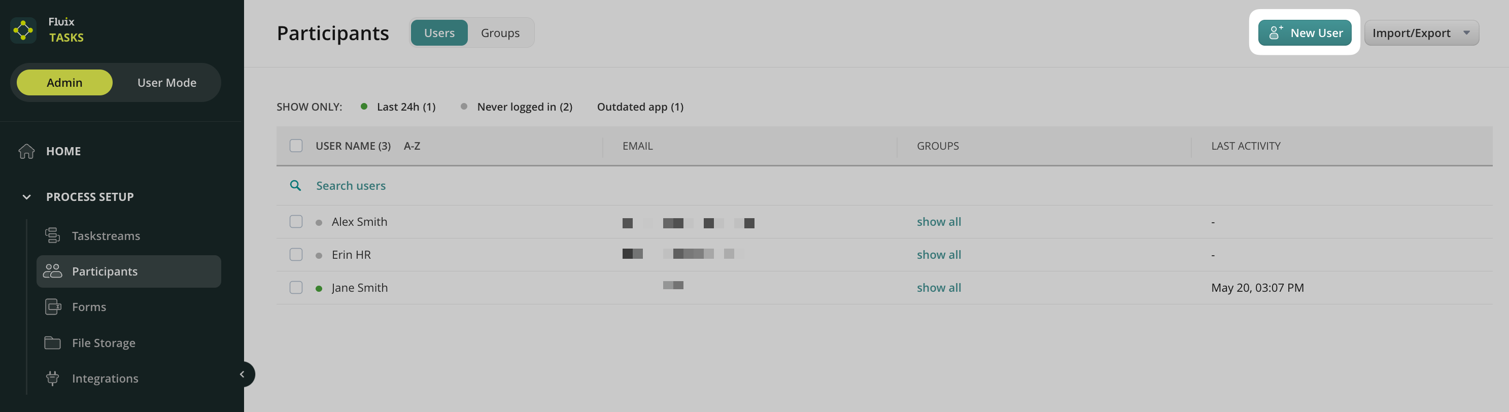 Participants are the users you add to your Fluix Admin Portal and organize them into groups. The first step in Fluix setup is adding users and then assigning them to the groups for further participation in taskstreams. This way, the users will have assigned tasks to fill out forms, review and approve each other’s work, and submit the completed work through the process. Users and Groups are managed in the Admin Tab -> Process Setup -> Participants section. Then, fill out the form with the new user’s info.