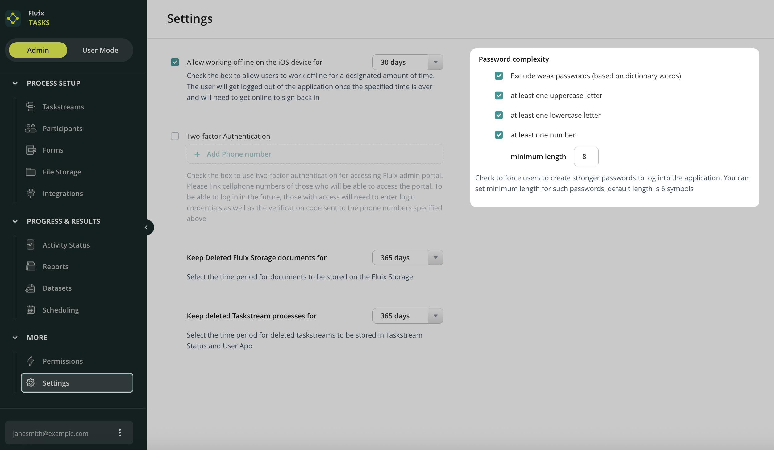 Please note that you can define the complexity of the users’ passwords. This option is available in the Admin tab -> More -> Settings tab.