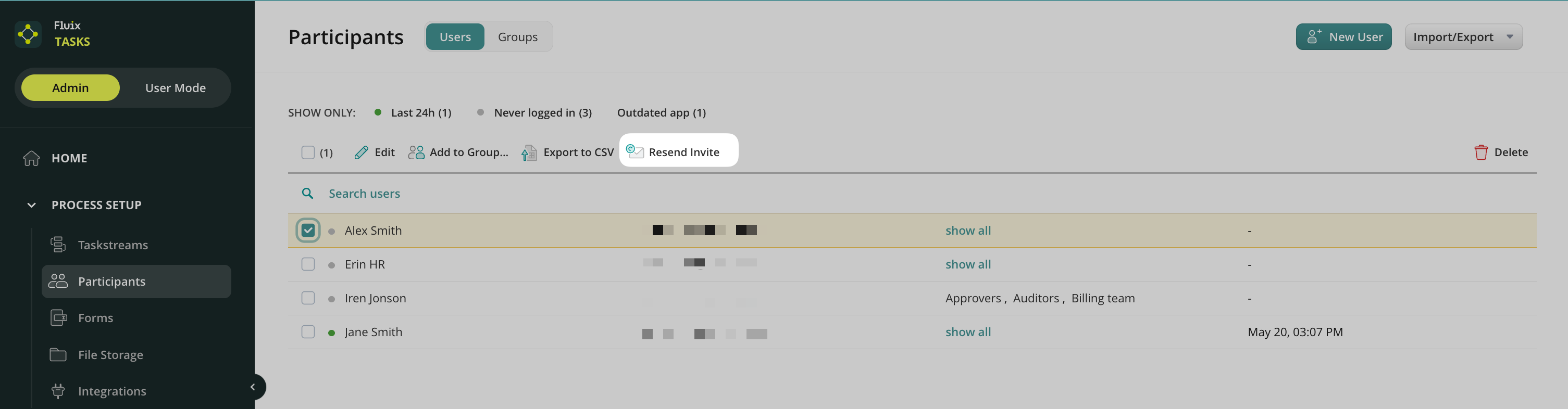 The invitation to access Fluix will be sent again to the selected user who hasn’t logged into the application yet.
