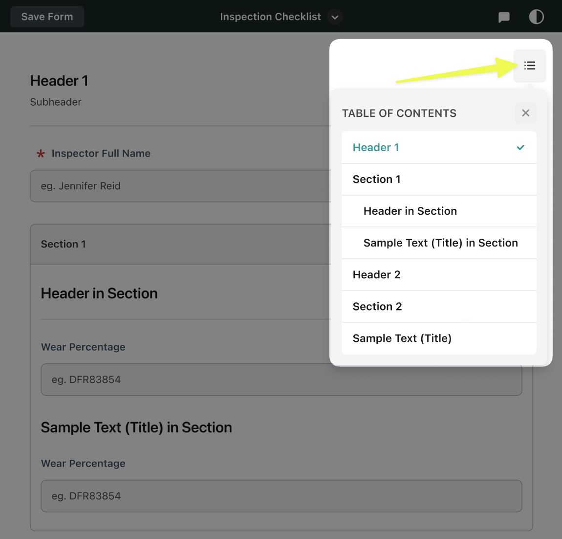 When working with long dynamic forms, it can be challenging to quickly locate the section you need. The Table of Contents helps by providing fast navigation to specific parts of the form.