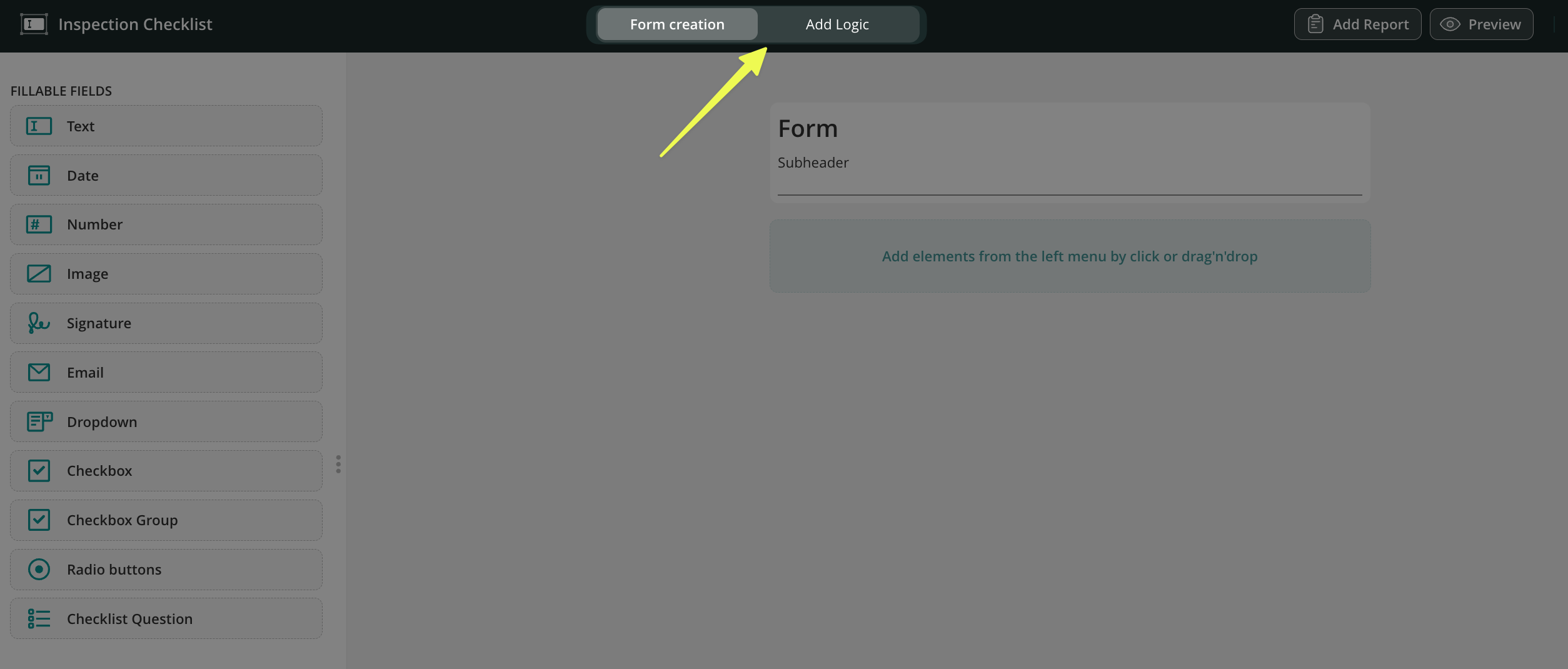 Add Logic tab– here you can configure the conditions for fields in the form to make them required, read-only, and hidden dynamically based on the options the users select in the form.