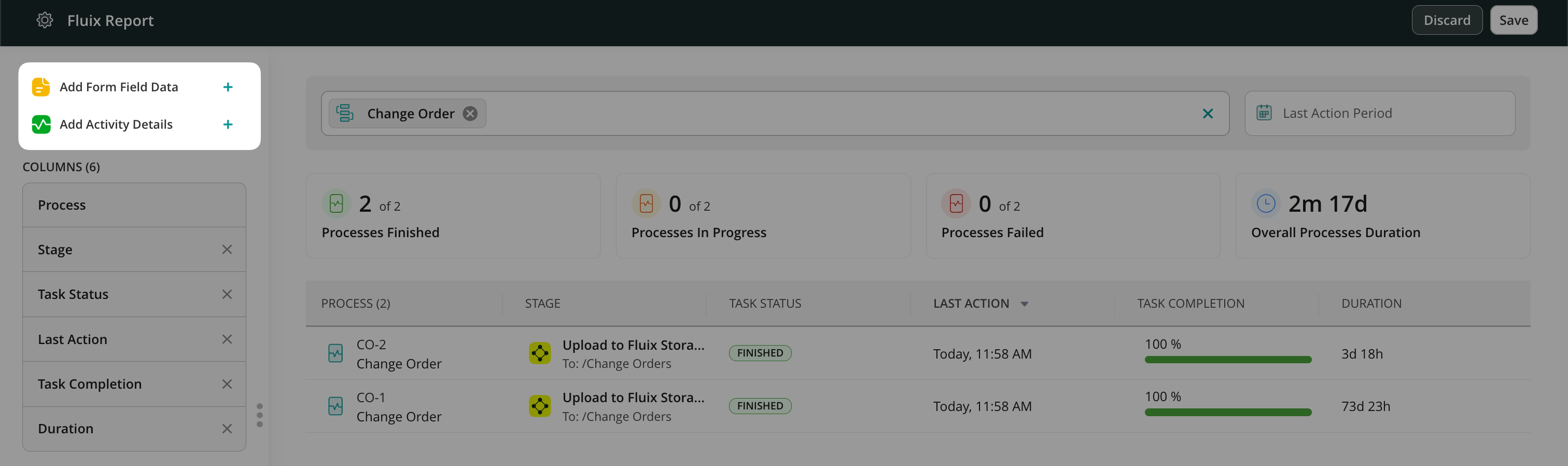 Save report configurations with columns and filters for quick access to frequently used reports, eliminating the need to start from scratch and enabling efficient navigation to specific processes.