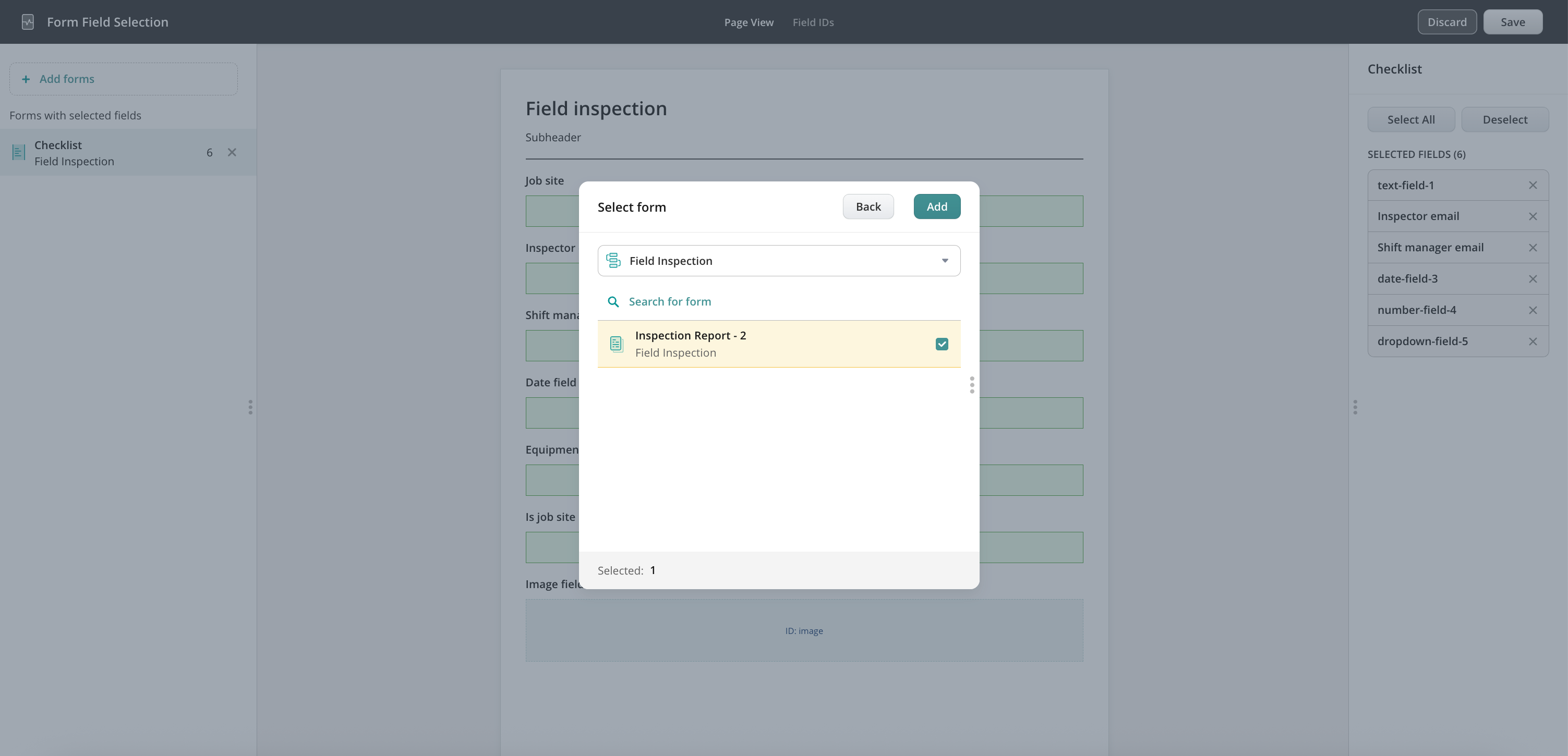 Select the fields from your Fluix form that you want to include in the report. In this example, we’ll show how to build a report for Field Inspections to analyze current trends. Choose the relevant fields from the form data, then click Add to include them in the report.