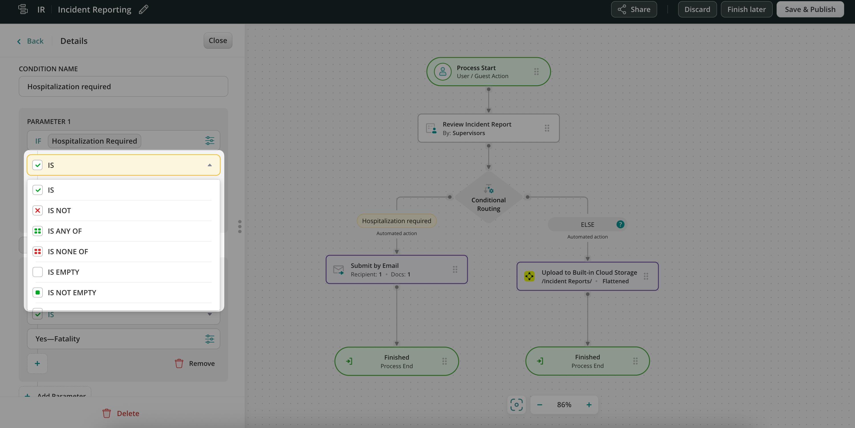 Click on the condition and configure it. In our example, the report will go down this branch of the workflow only if the site Supervisor enters Yes or Yes—Fatality into the hospitalization required field.