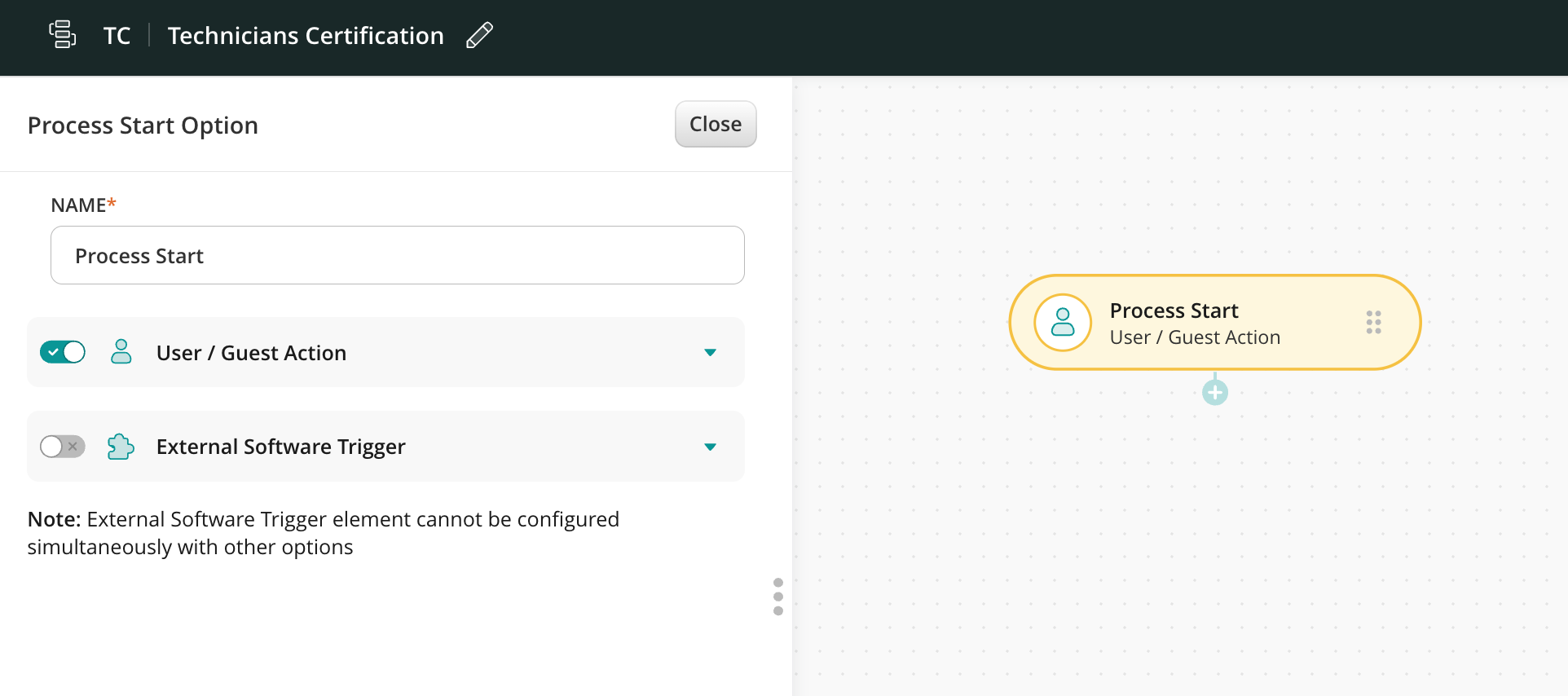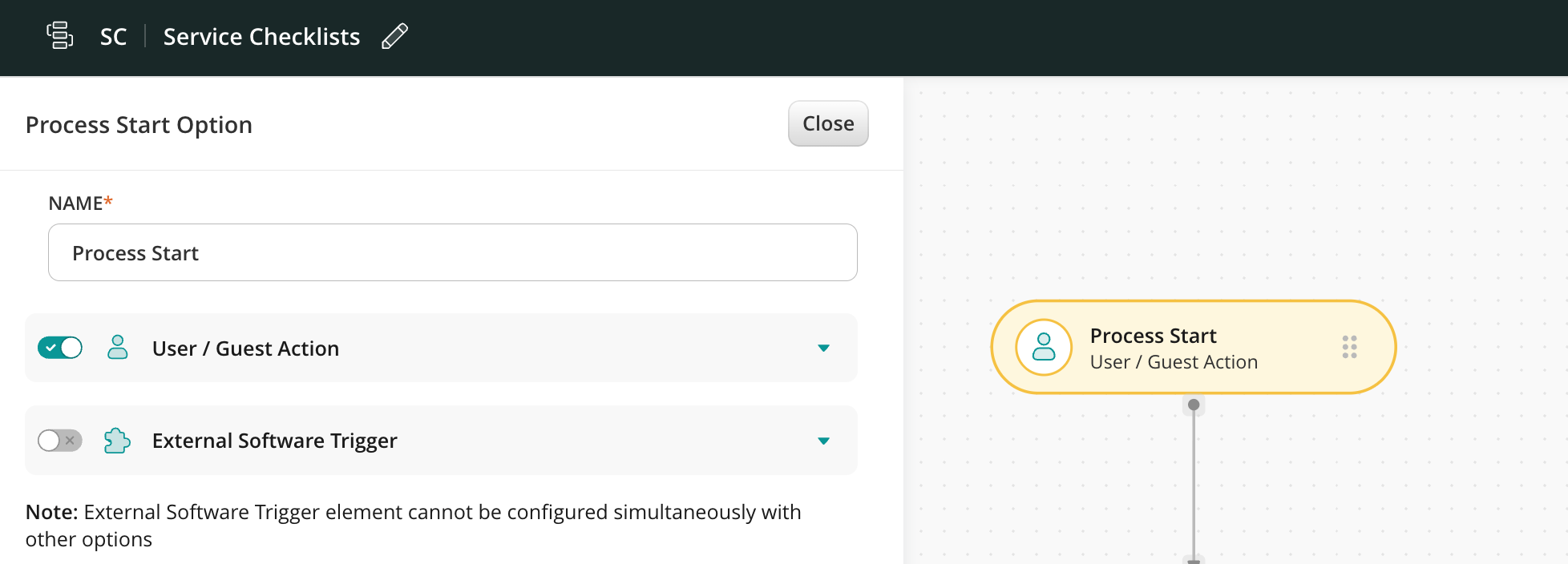 Drag and drop a Process Start event to the working area and select User / Guest Action.
