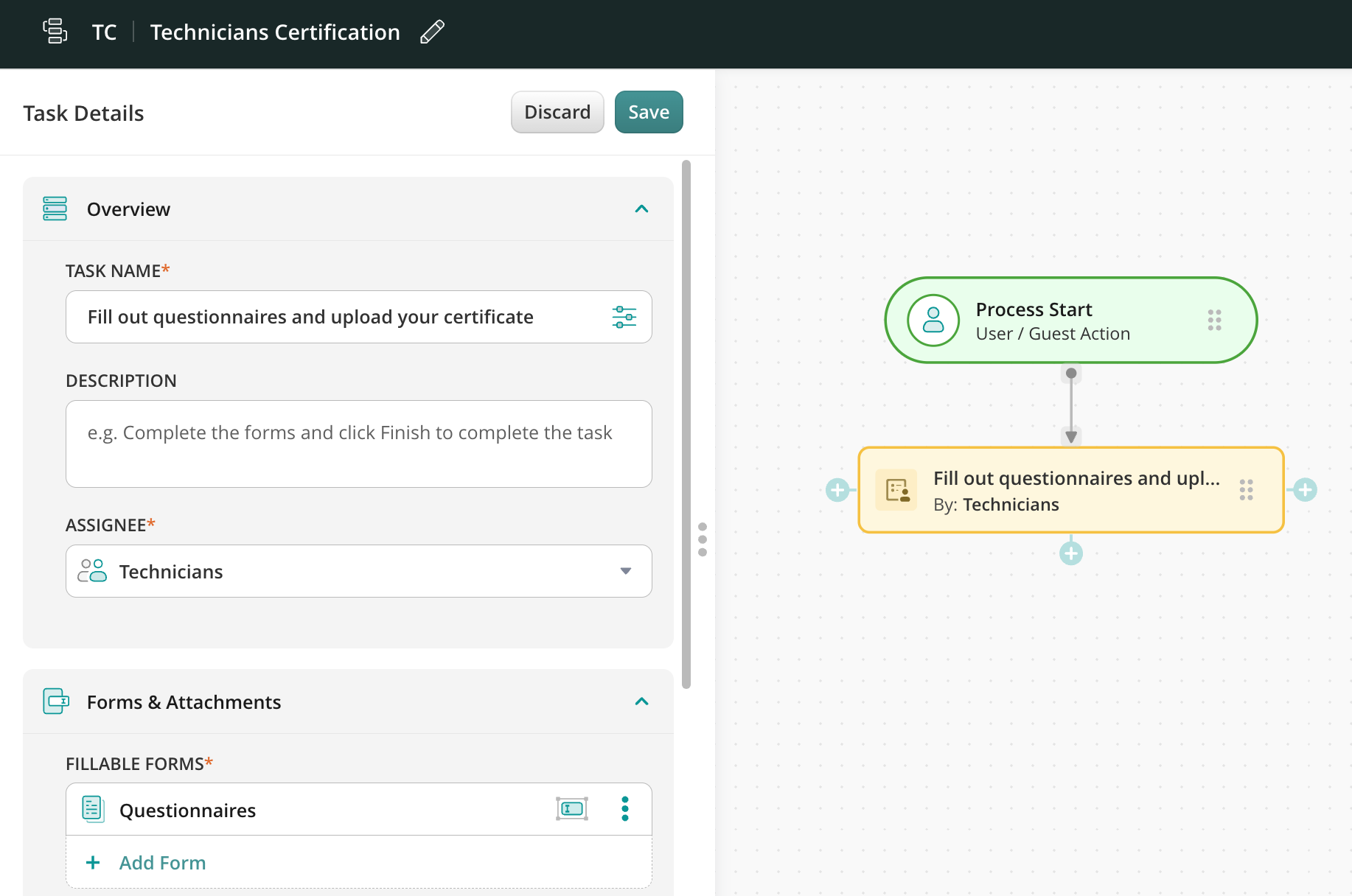 In the Forms & Attachments section, add the questionnaires and other documents you want Technicians to complete during their certification. You may upload them from your computer as PDFs, select the necessary form from the Forms section, or even create new questionnaires from the Taskstream builder.
