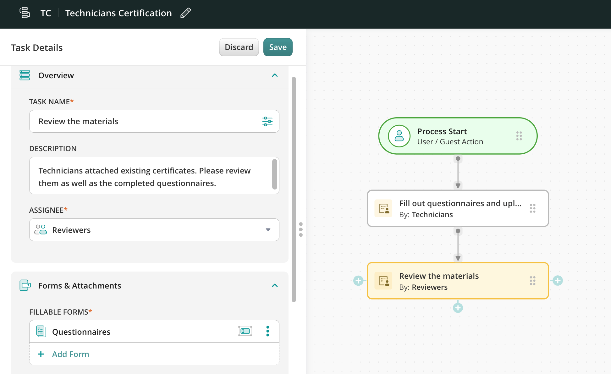 Drag and drop the next User task and configure it for the Reviewers group. In this task, the reviewers can quickly review the files that technicians filled out and attached in the previous task.