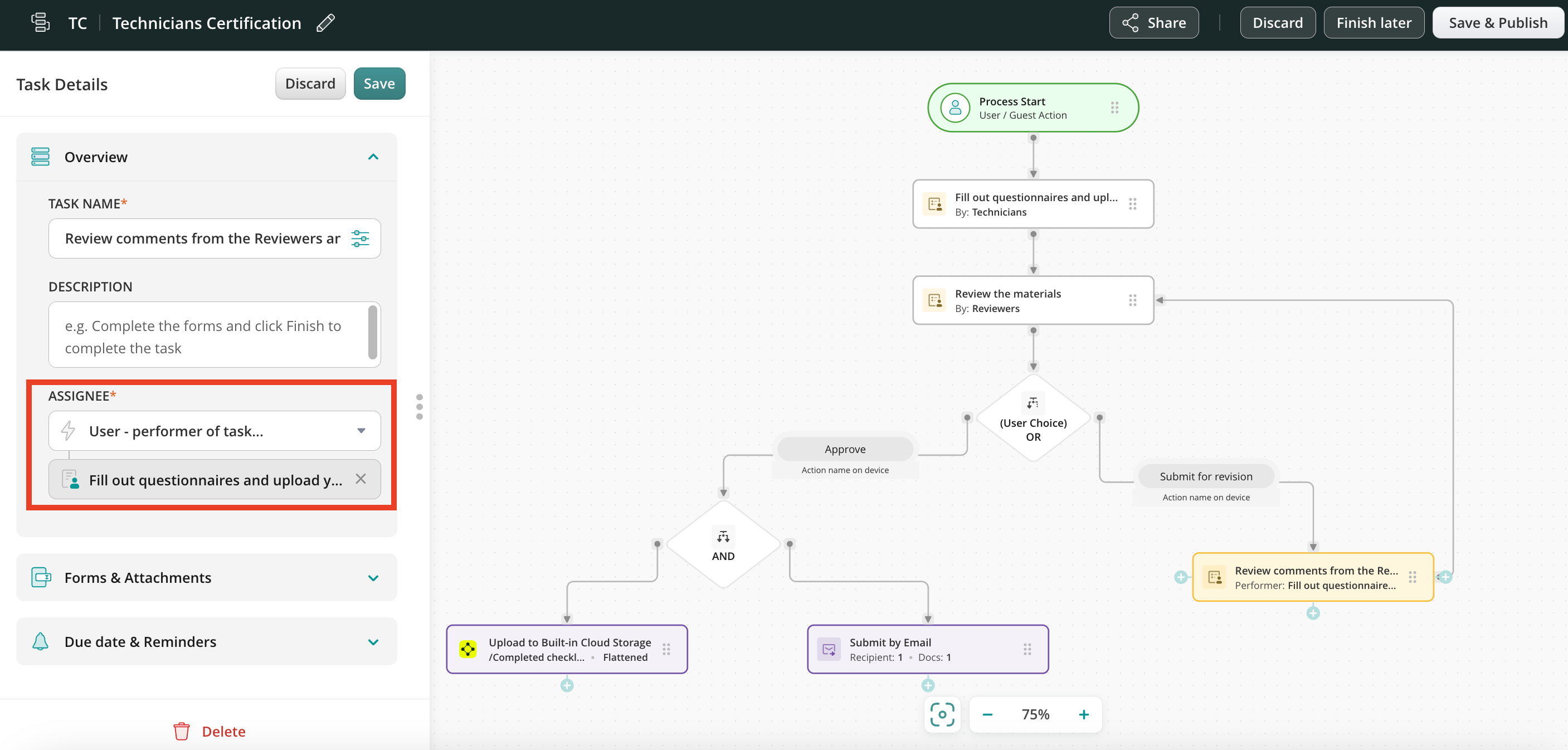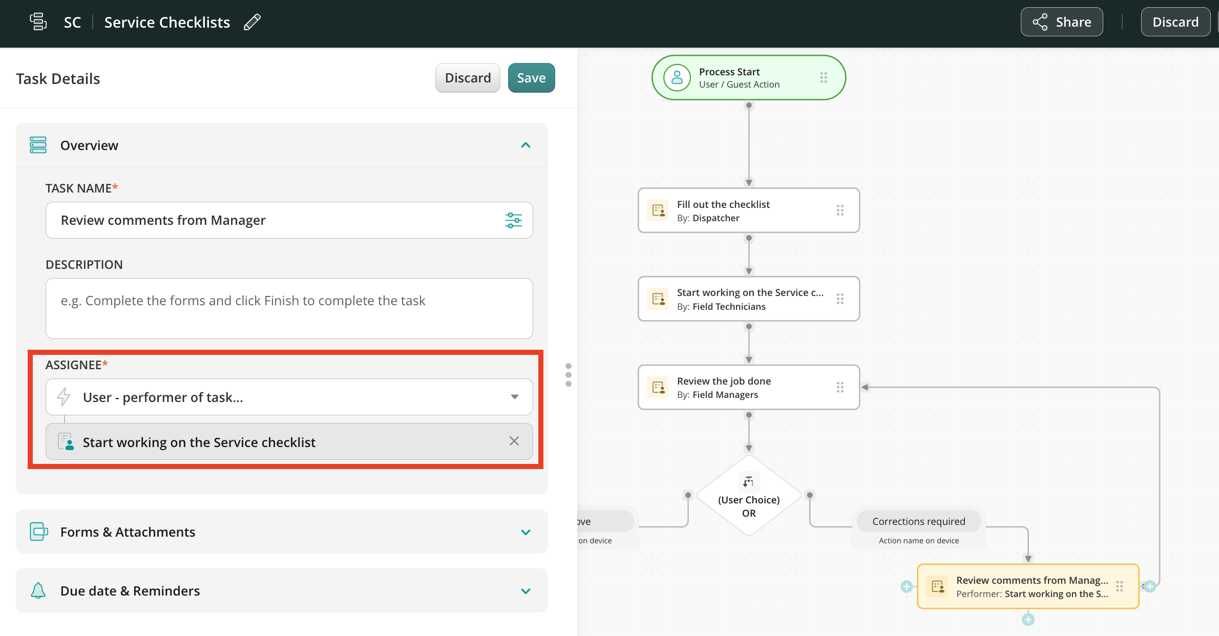 Add one more user task for the revision. In this task, the user from the Field Technicians will correct the checklist if Field Manager submits it back for revisions. Connect it with the previous taskReview the job done to allow the technician to submit the form for edits again.