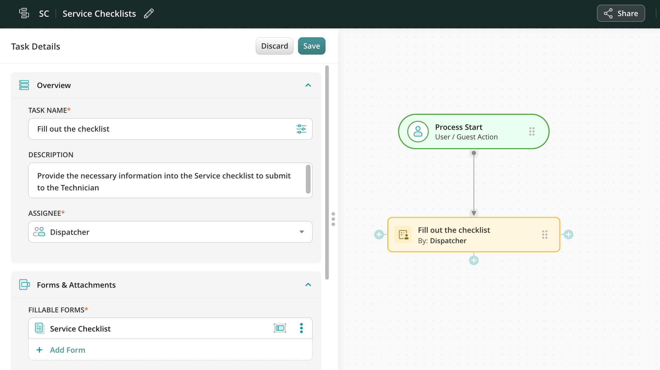 Dispatcher Initiation: A Dispatcher begins the process by pre-filling the Service Checklist for a Field Technician.