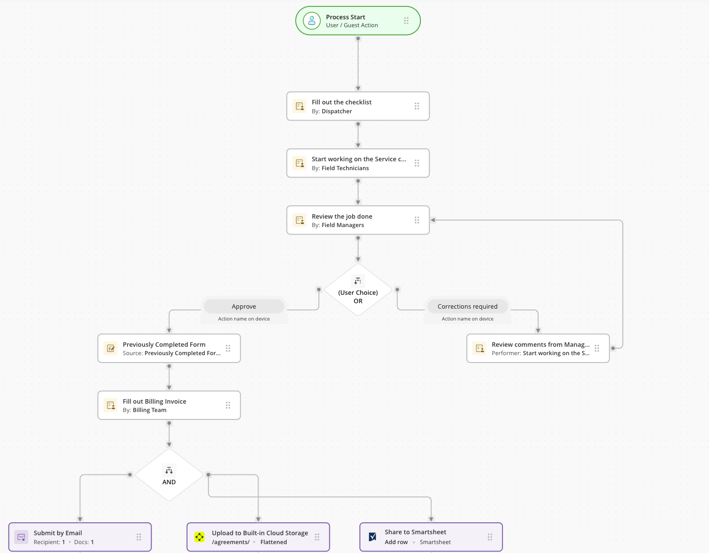 Conditional routing in Fluix routes completed forms to different emails, cloud storage and a CRM, or returns a task for another round of approval, and many other scenarios. Below we collected a couple examples for your convenience.