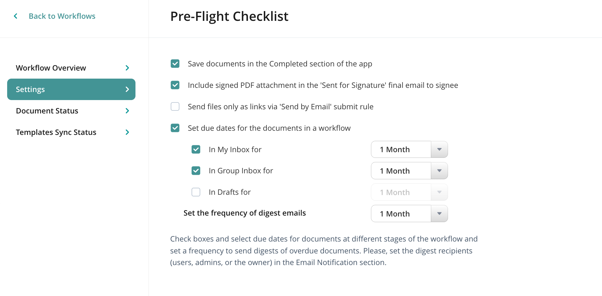 - Select due dates for documents at different stages of the workflow, e.g., My Inbox or Group Inbox, and set a frequency for sending digests of overdue documents.