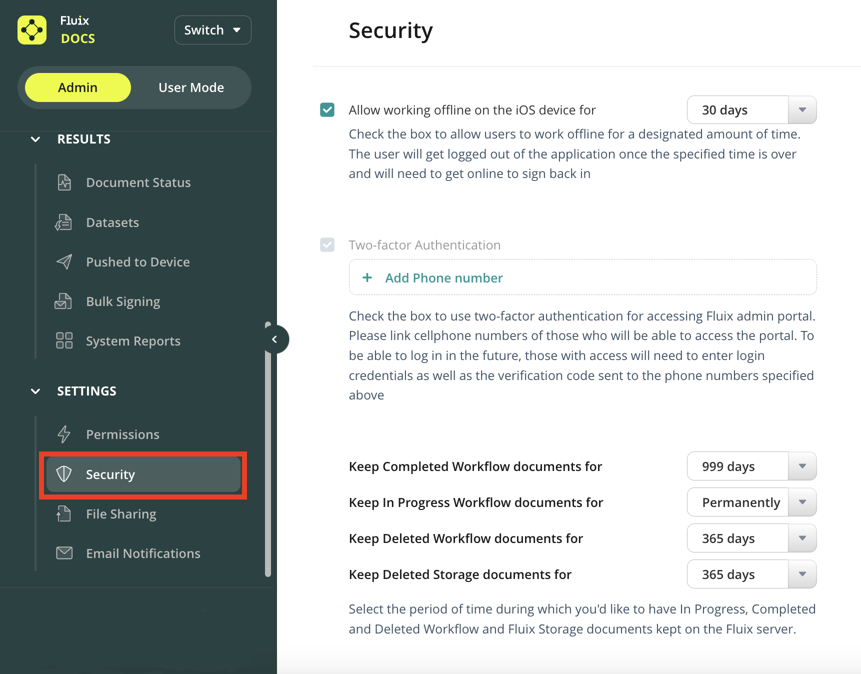 - Retention policy – is the amount of time during which all workflow documents on different stages (e.g. Drafts, My Inbox, Group Inbox, Sent for Signature, Completed, Deleted) will be stored on Fluix servers.