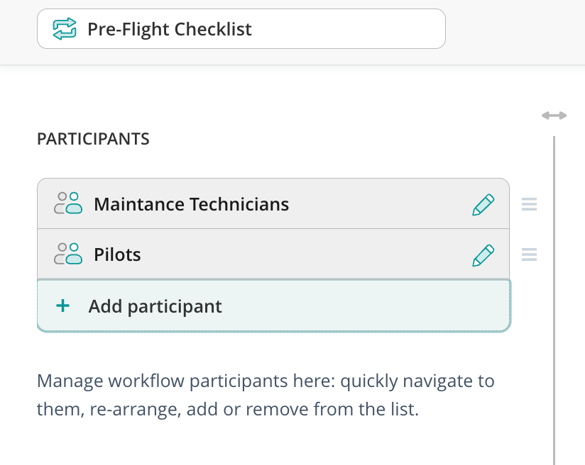 Once you add participants, you can organize and manage them in the workflow builder. The left-hand sidebar displays a list of participants, which you can adjust by dragging, replacing, or adding new ones.