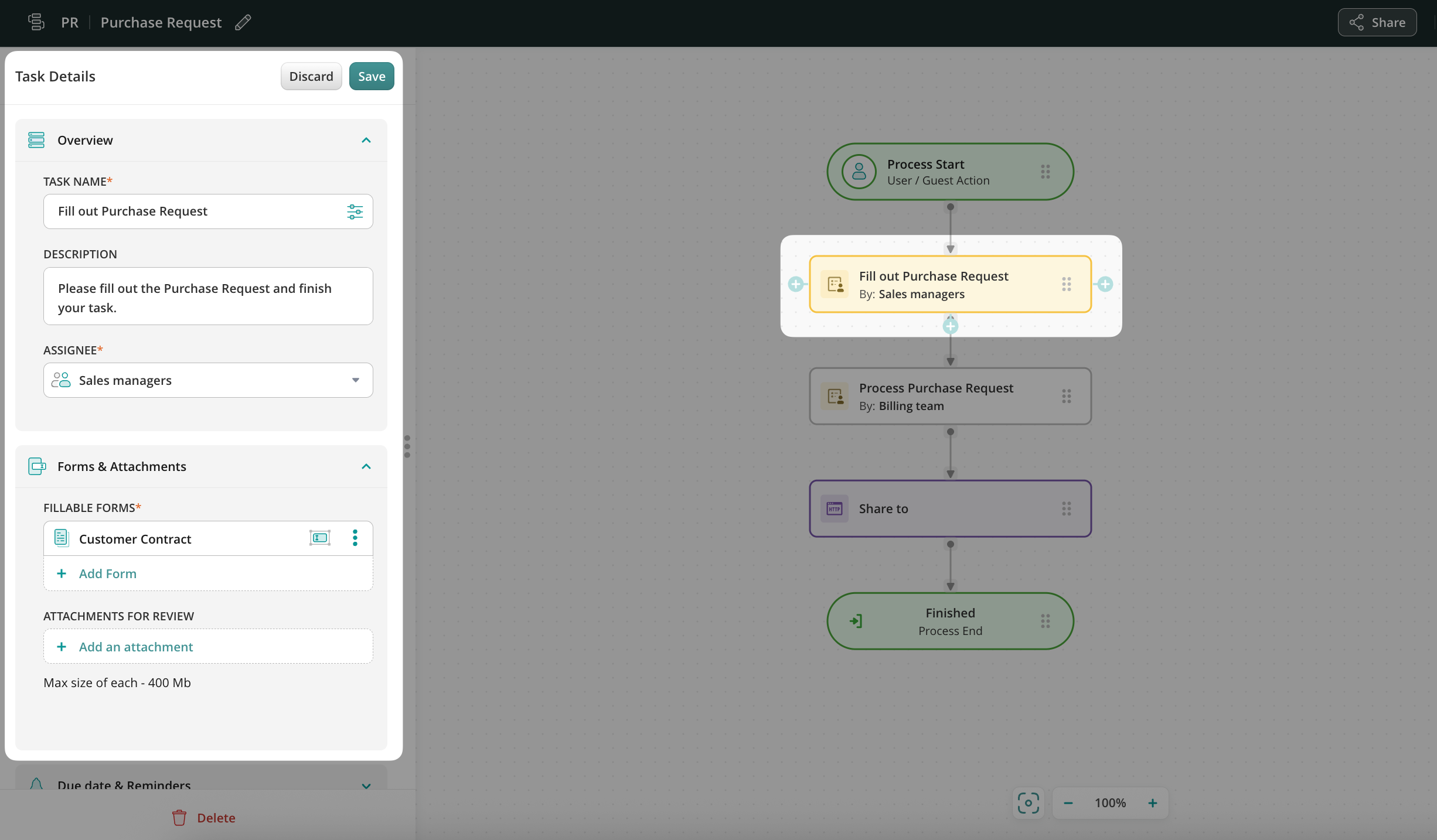 Drag and drop Share to submit action to the workflow builder chart and connect it with the task that your team will be working on.
