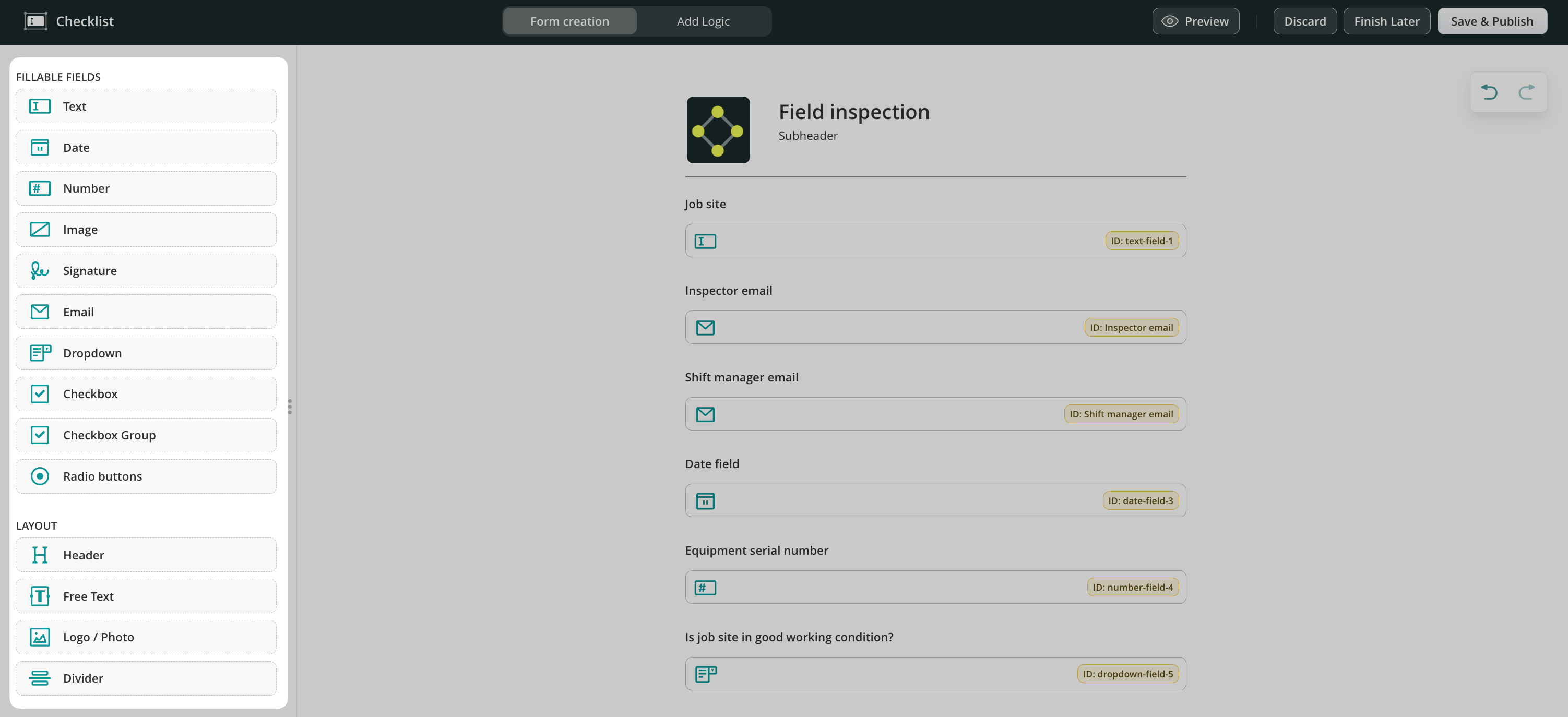 - Layout – helps you customize your forms by adding a header, text, your company’s logo, and a divider.