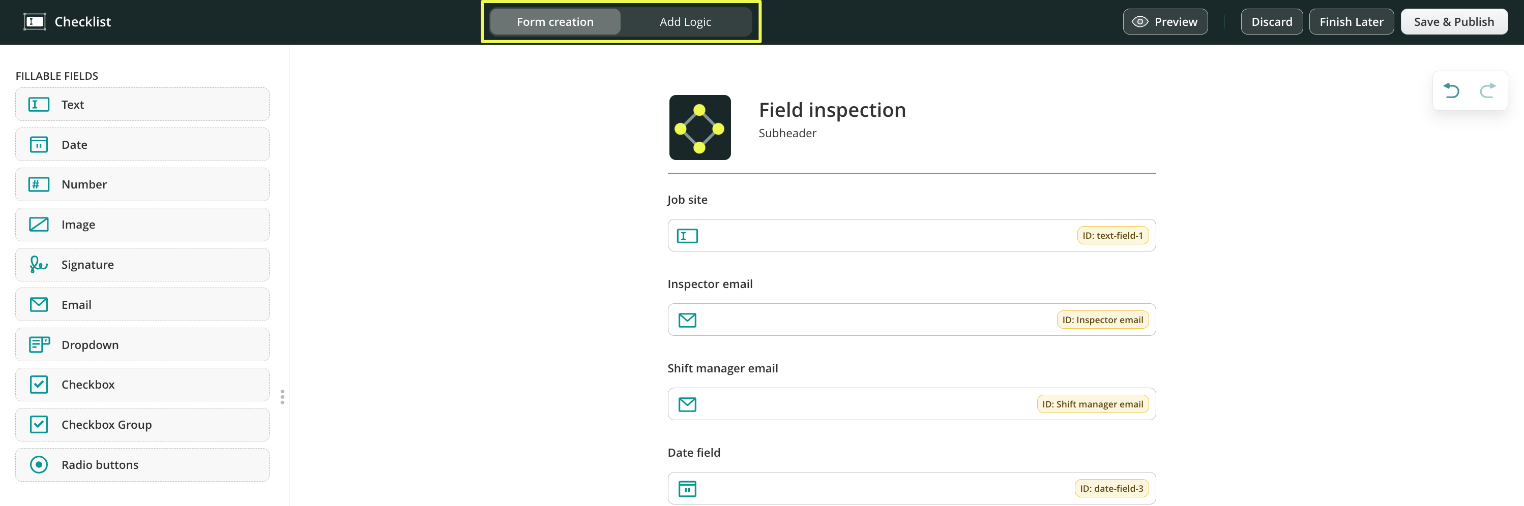 - Fillable fields – the different types of fields to add to the forms to collect the most relevant data.