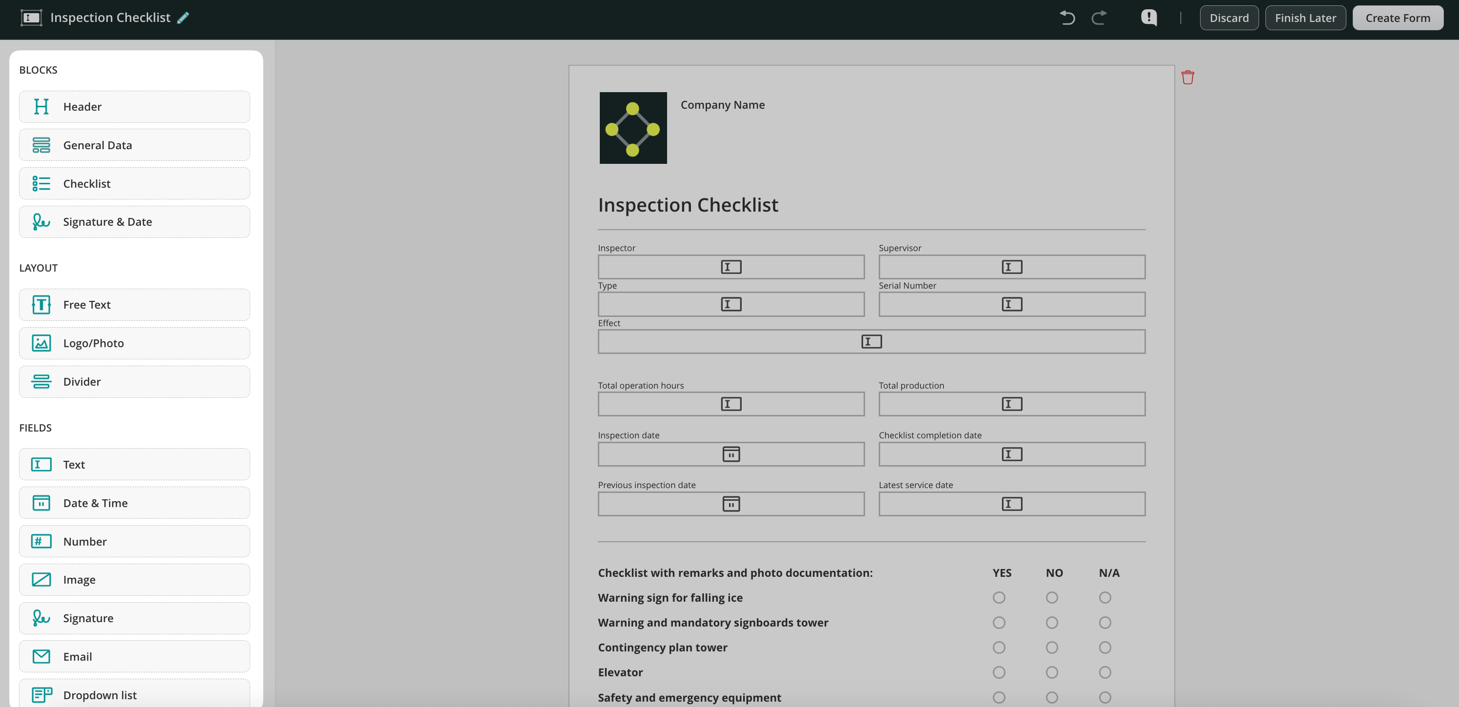 - Fields – the different types of fields to add to the forms to collect the most relevant data in the forms.