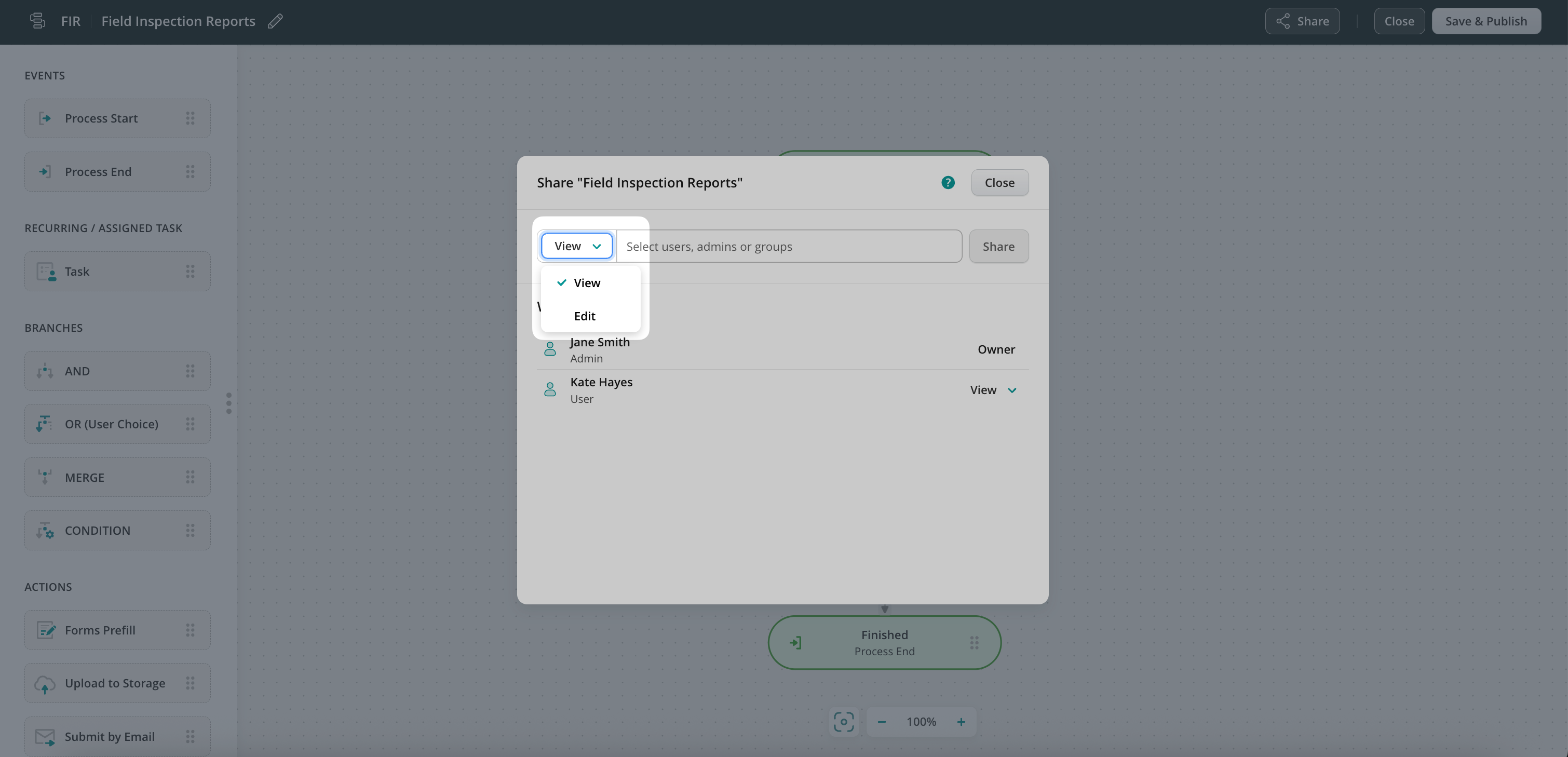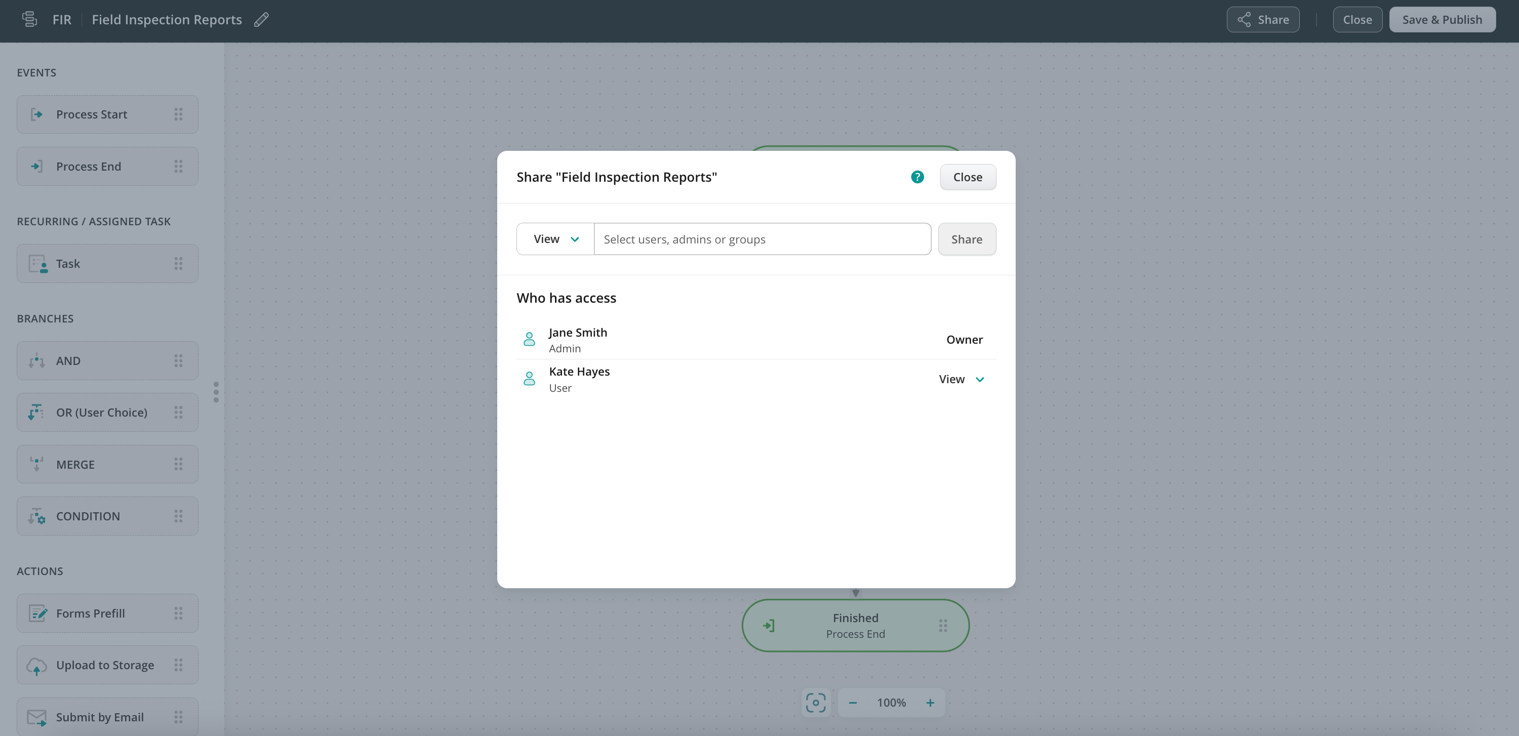 Giving your users the proper permissions in the Admin Portal is key to efficiency and more protected team processes. With Fluix’s advanced permissions, admins can now grant access, assign ownership, and manage sharing for Workflows and Reports.