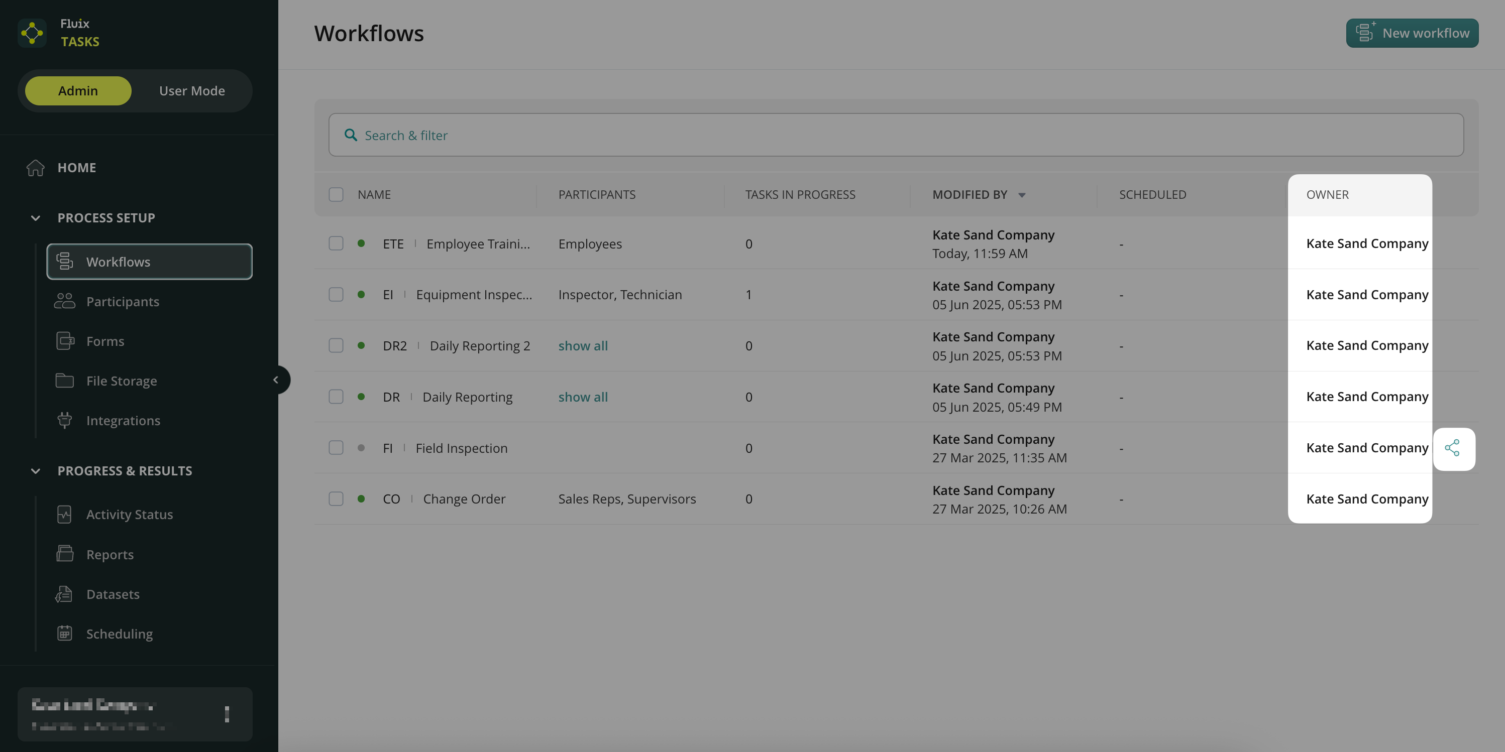Once enabled, any new Workflow or Report created by this admin will list them as the owner. You’ll also see a new column showing the owner’s name in the Workflows and Reports sections.