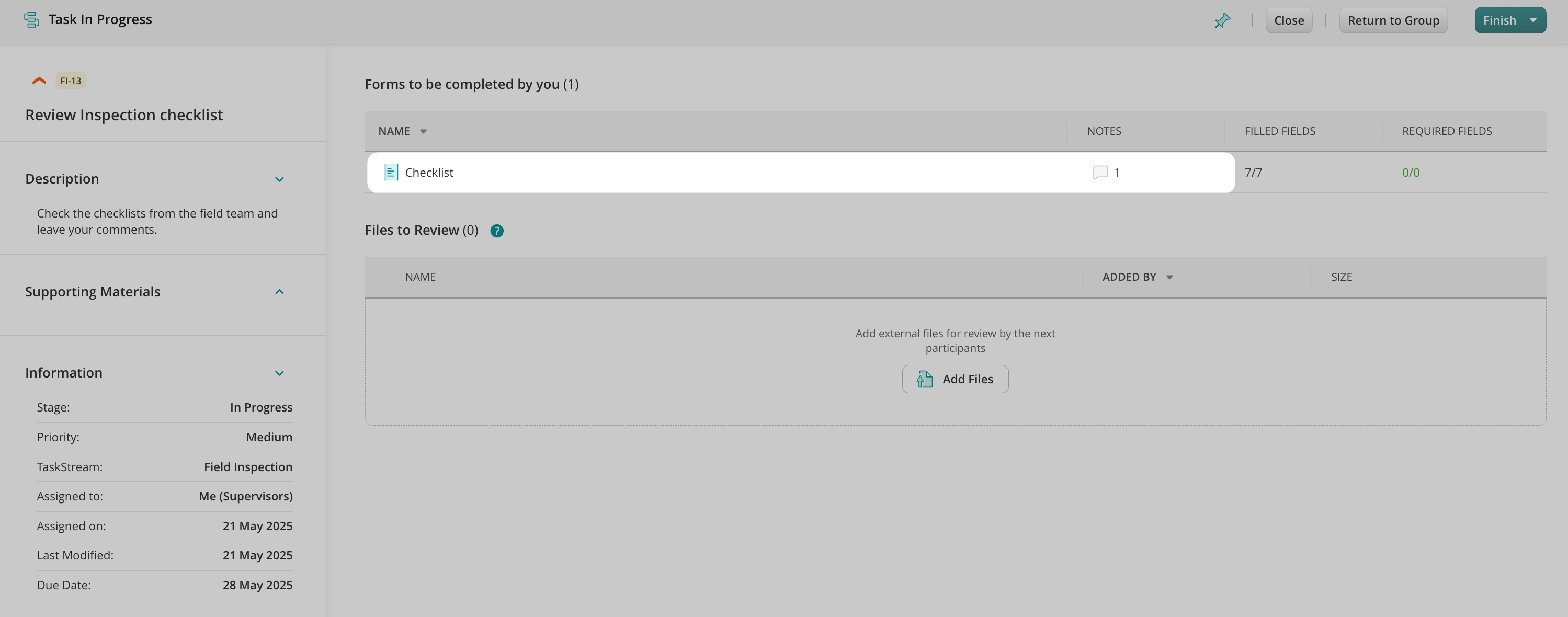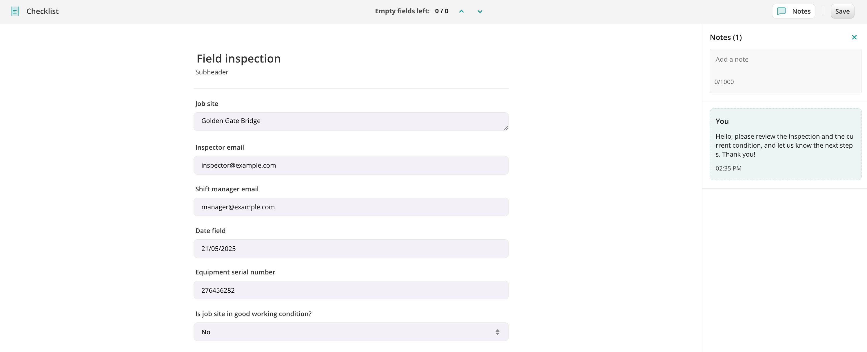 Notes allow users to easily share additional context with other workflow participants about the work done or changes needed on a form.
