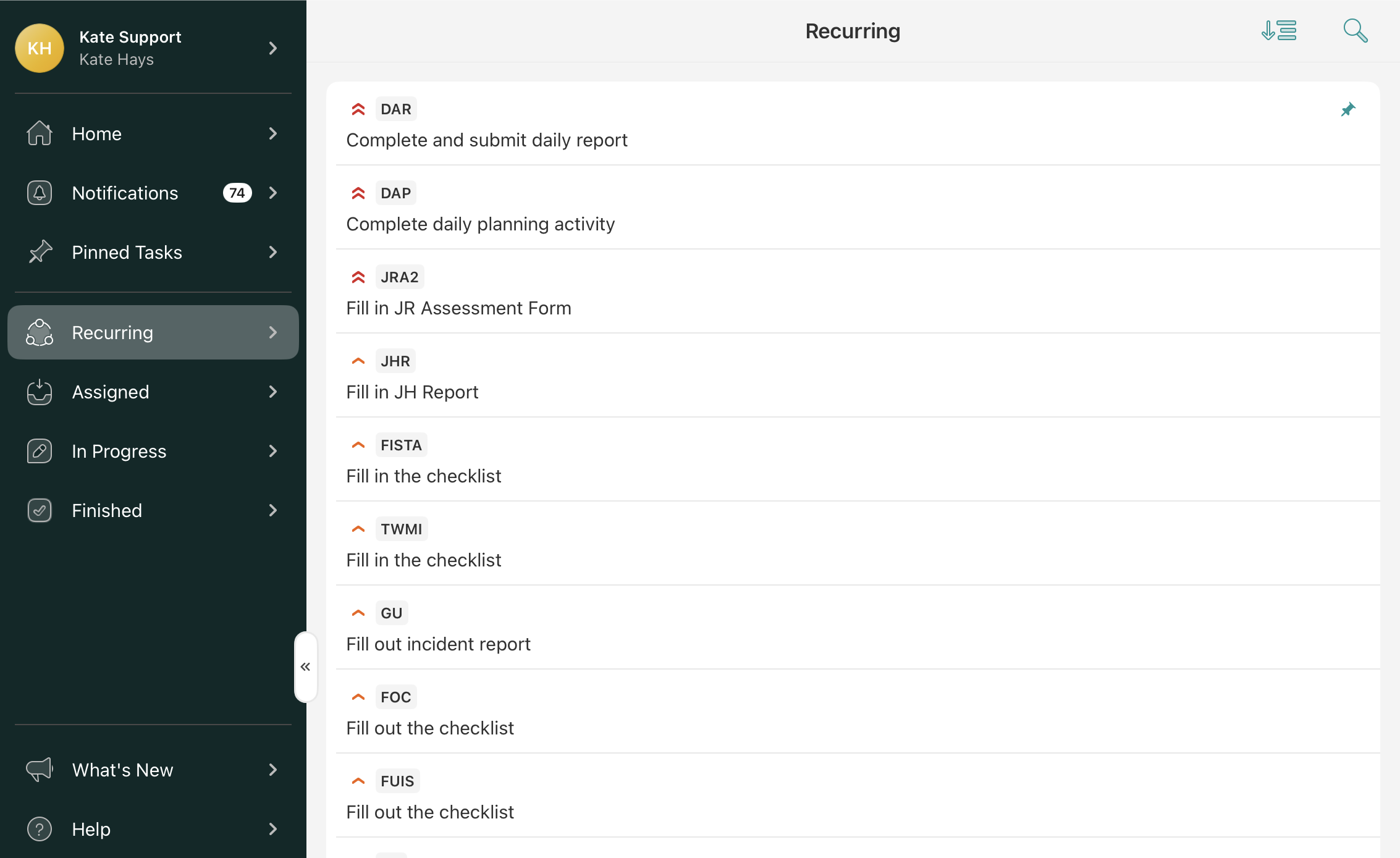 The recurring section displays the tasks with the documents pre-configured by your company admin. You can initiate them at any time, even offline. Since these tasks are always available in the Recurring tab, you may initiate as many tasks as needed with empty template forms ready to be filled out.