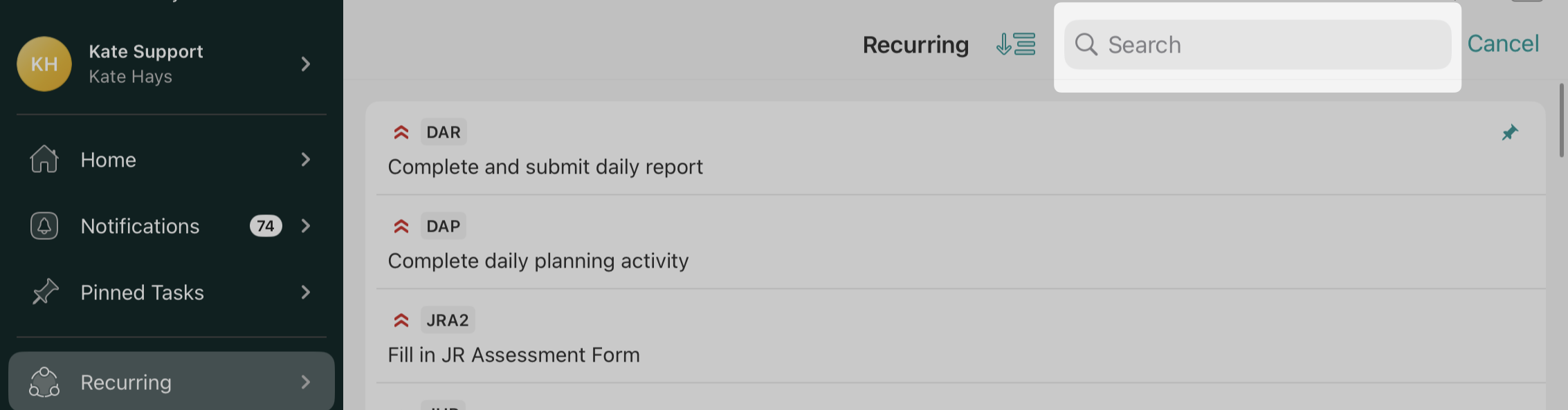 In the upper right corner of the Recurring section, use the Search icon to locate the tasks you need to complete.