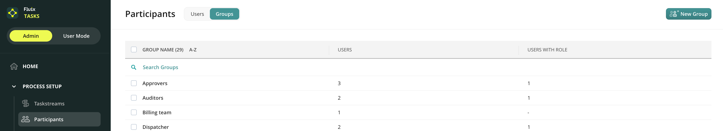 1) User Groups that will participate in a Workflow. Navigate to Admin tab -> Process Setup -> Participants section to create the Groups and add the users: