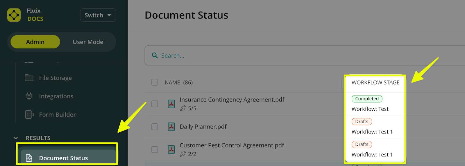 Yes, you can see the status of the documents that people are working on by navigating to the Document Status tab under the Results section, which provides a full audit trail for all documents and their statuses in all workflows.