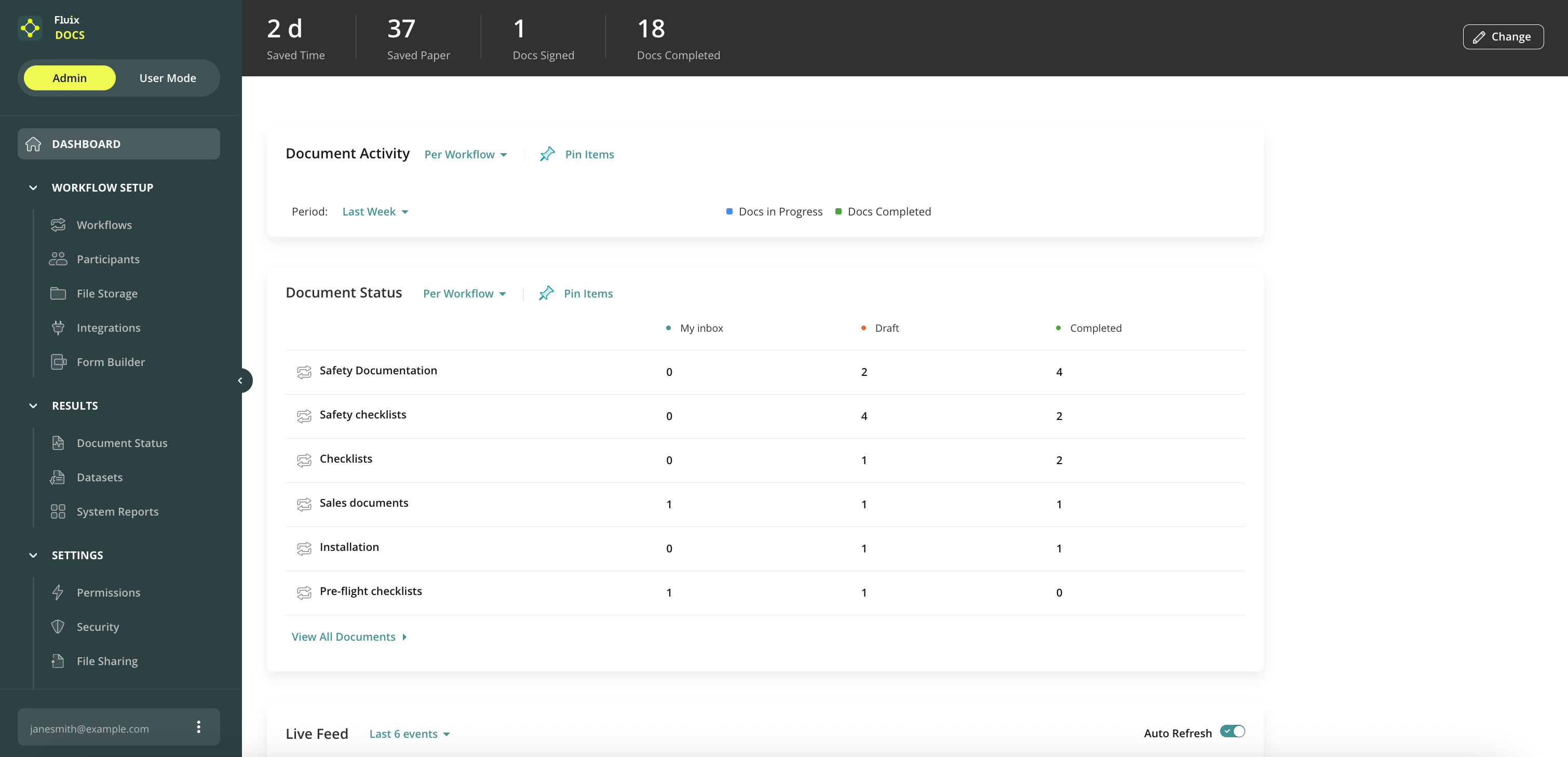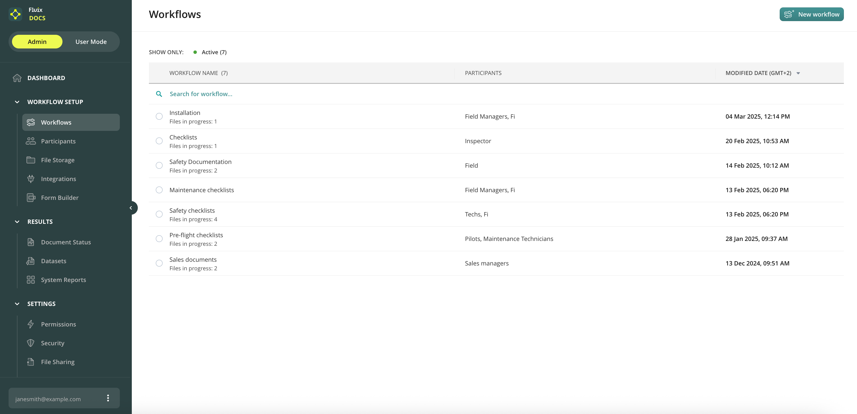 Fluix Admin Portal is the main hub for Fluix admins. There they can perform all sorts of account-related tasks such as creating and managing workflows and taskstreams, tracking users, document workflow, tasks, and activity, making any changes to settings, etc.