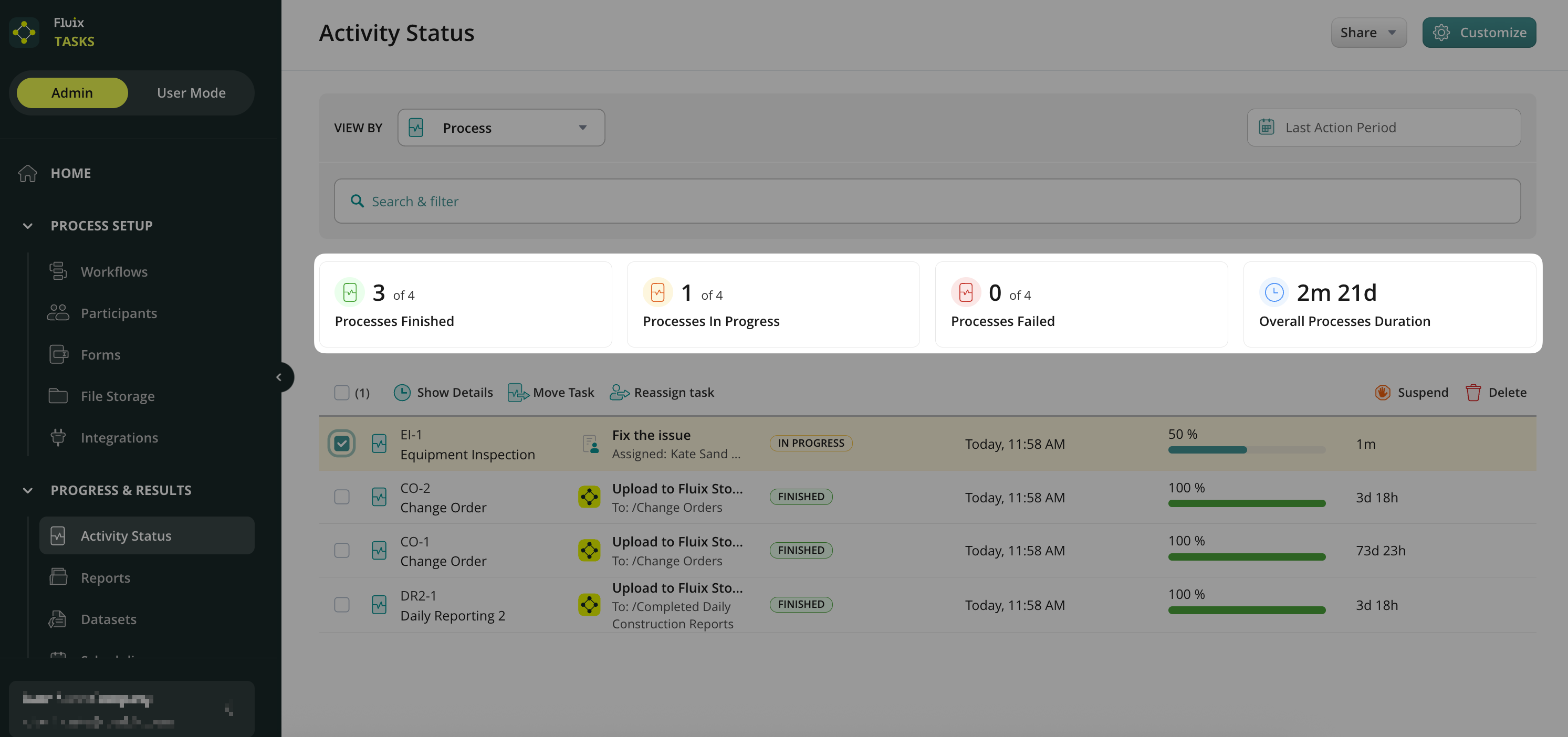 Widgets with the results of your team’s activity in Fluix will significantly help since they allow admins to check data at a glance without the need to dive into the table view of the report. By default, there are four widgets related to the Process view on the screen: