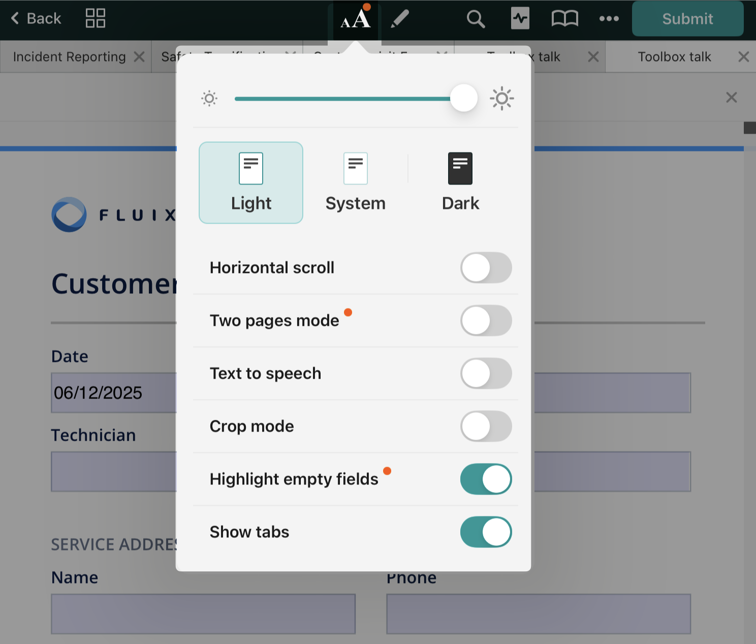 In the Fluix Docs app, when you open the PDF, you may see the ‘aA’ icon at the top. Tap on it to explore additional actions that you may configure to improve your daily work with PDFs. For example: