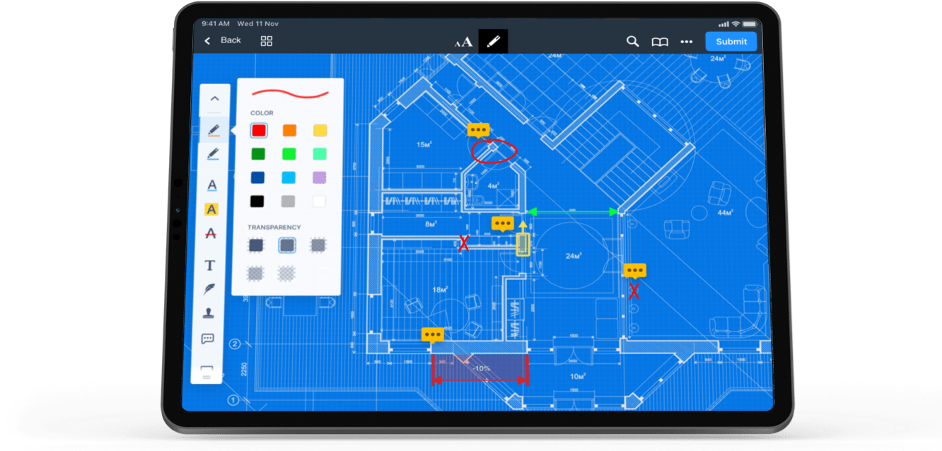 Upload, distribute, edit and mark-up construction drawings and plans, approve material providers and monitor quality through punch lists and quality control workflows.