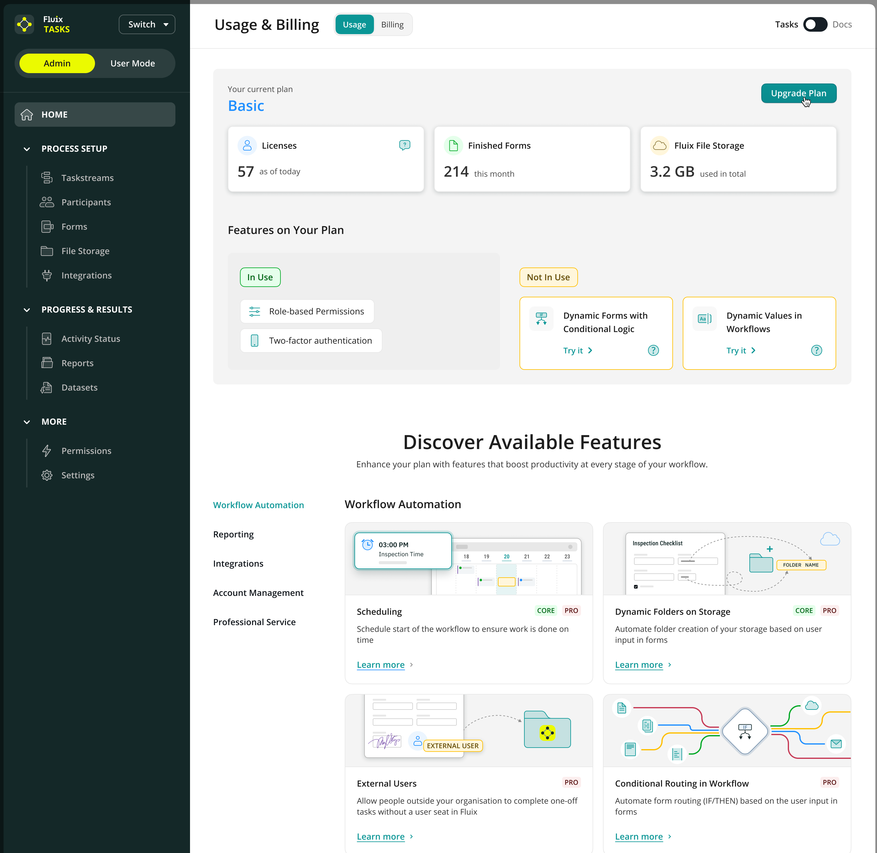 • Introducing the new feature to help you get acquainted with your Fluix Plan – Feature Usage Stats. With this update, you can now: